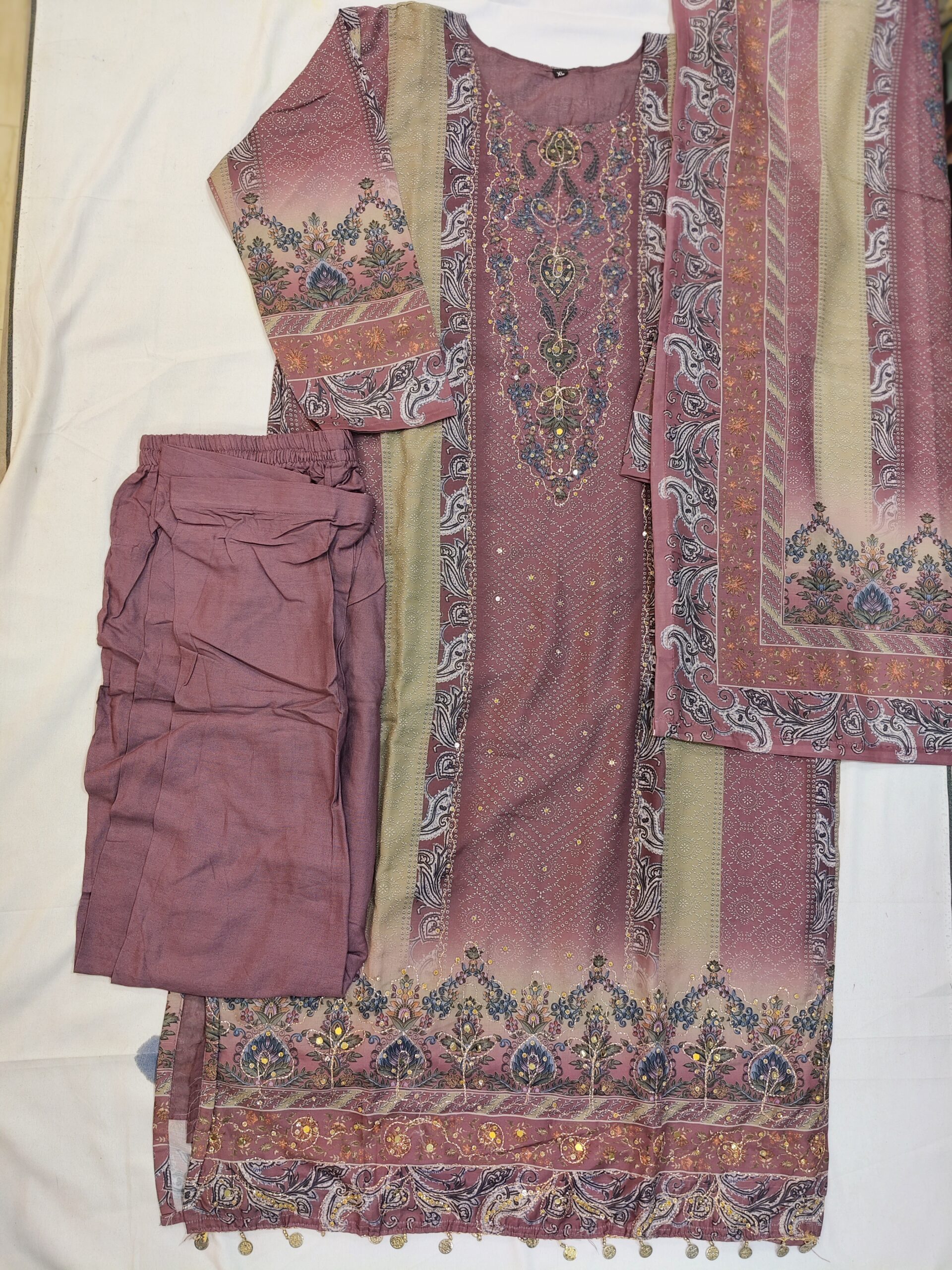 Multicolor embroidery work, Round neck, 3/4th sleeve, below knee length Top with straight pants & Printed dupatta