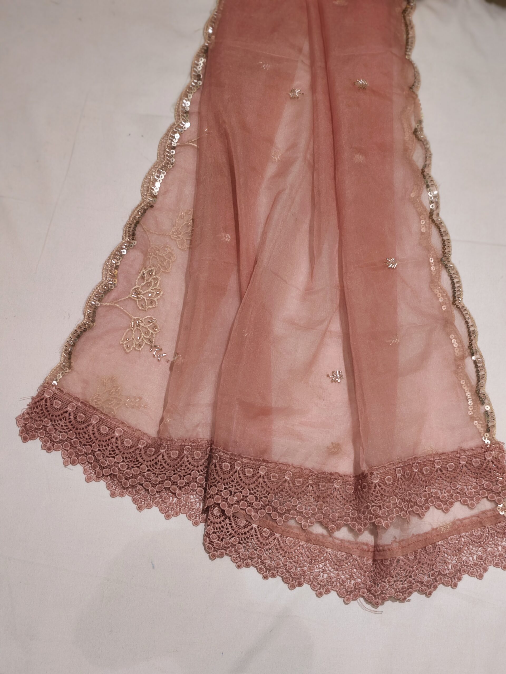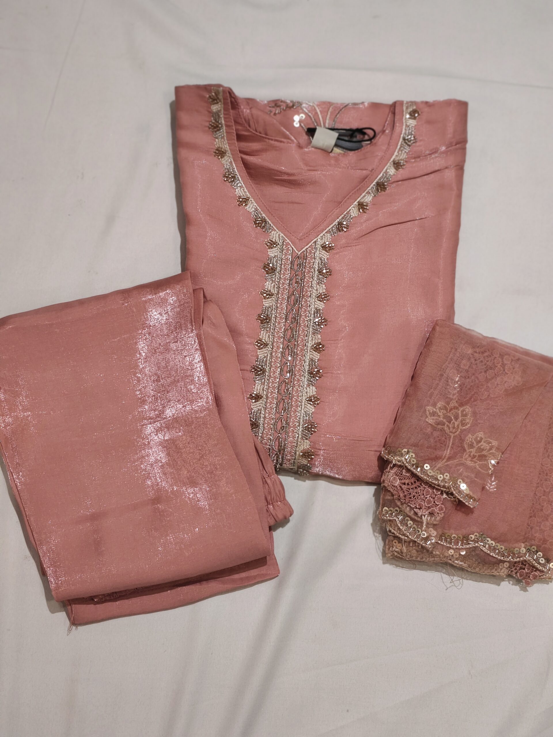 Peach floral embroidery, V neck, 3/4th sleeve, below knee length Top with straight pants & printed dupatta