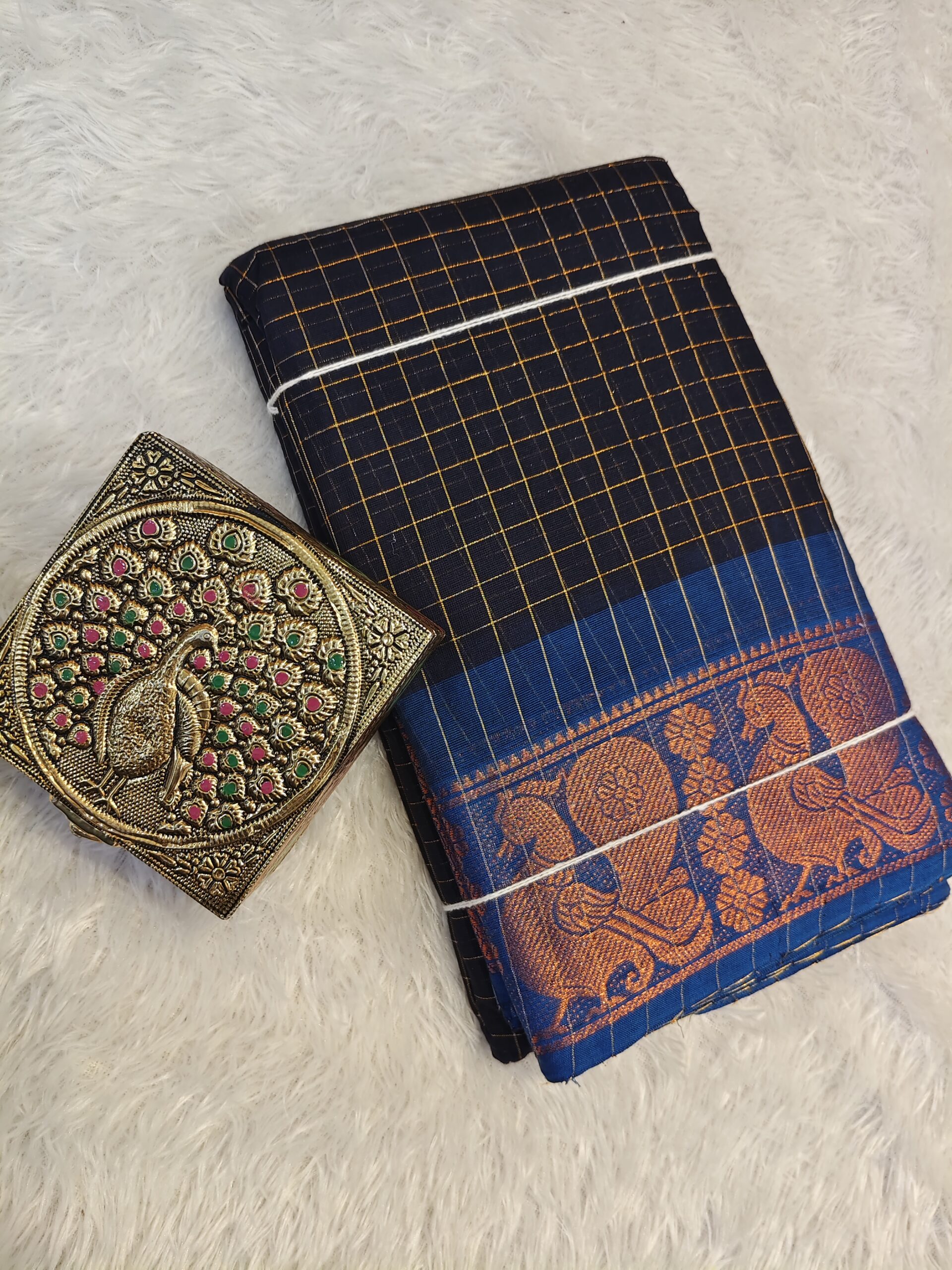 Traditional madurai sungudi checked cotton saree with golden zari peacock design contrast border | Soft & Lightweight Cotton Saree Without Blouse | 5.5 Yards Saree, Workwear & Festive Wear
