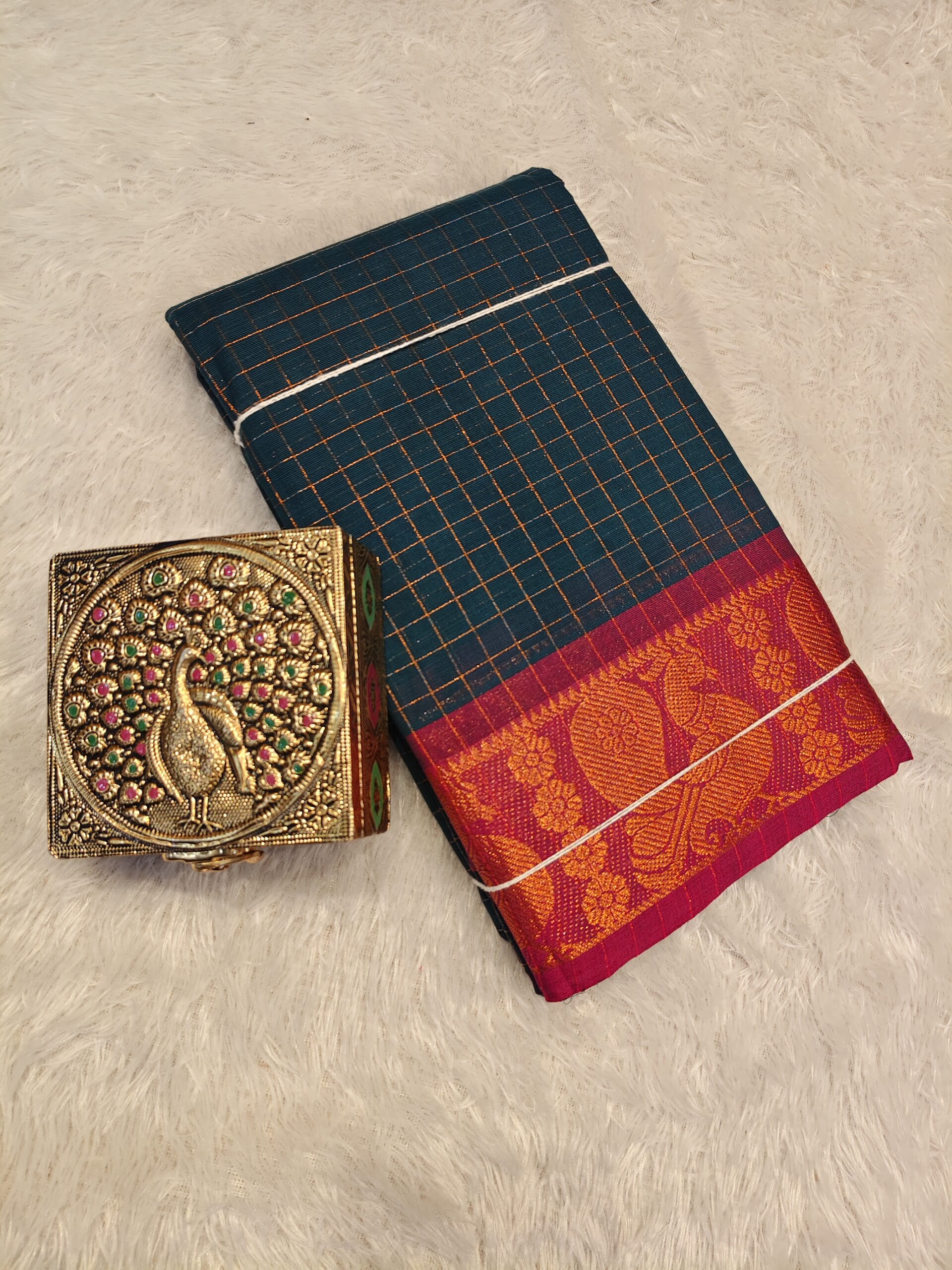 Traditional madurai sungudi checked cotton saree with golden zari peacock design contrast border | Soft & Lightweight Cotton Saree Without Blouse | 5.5 Yards Saree, Workwear & Festive Wear