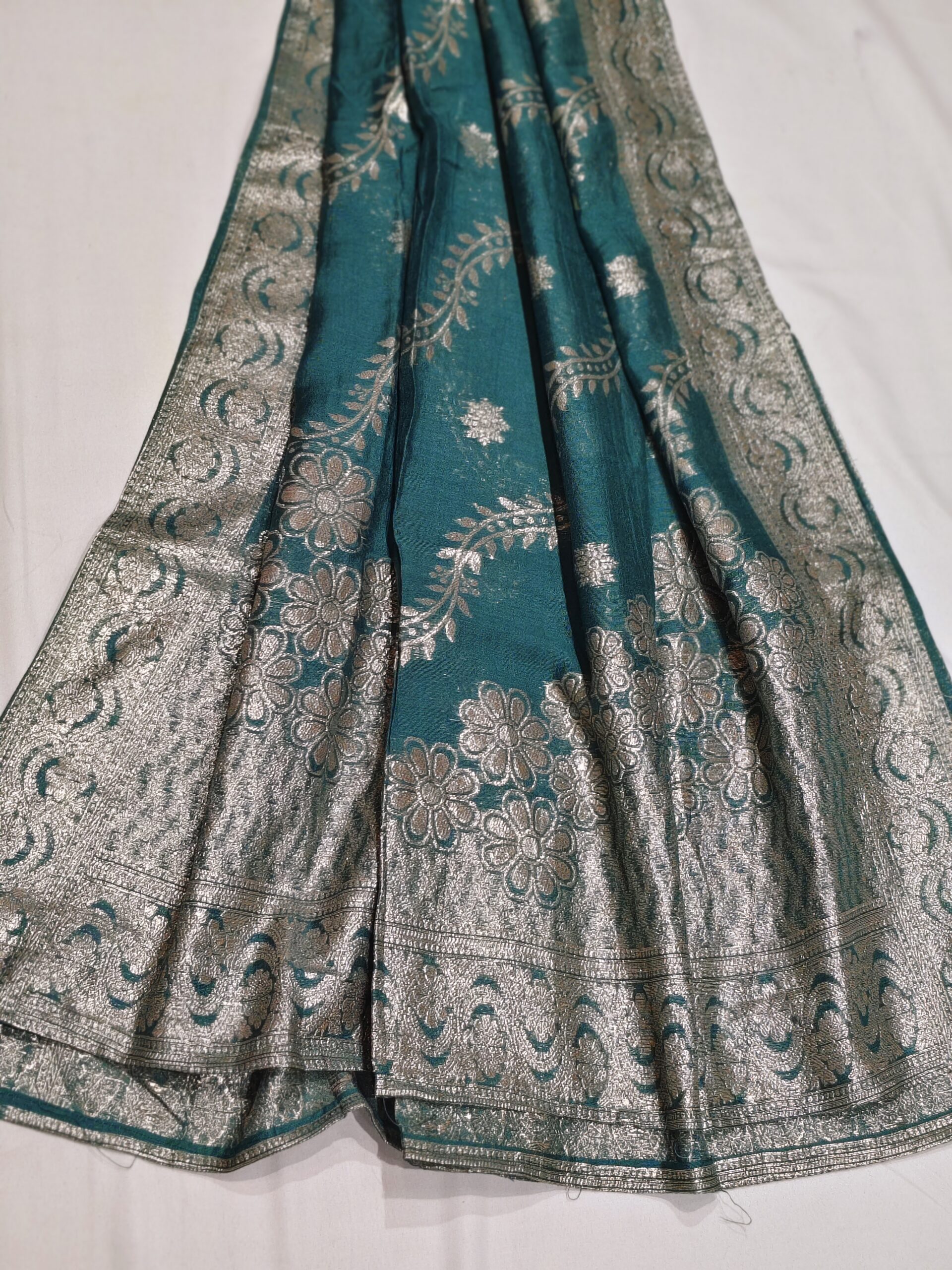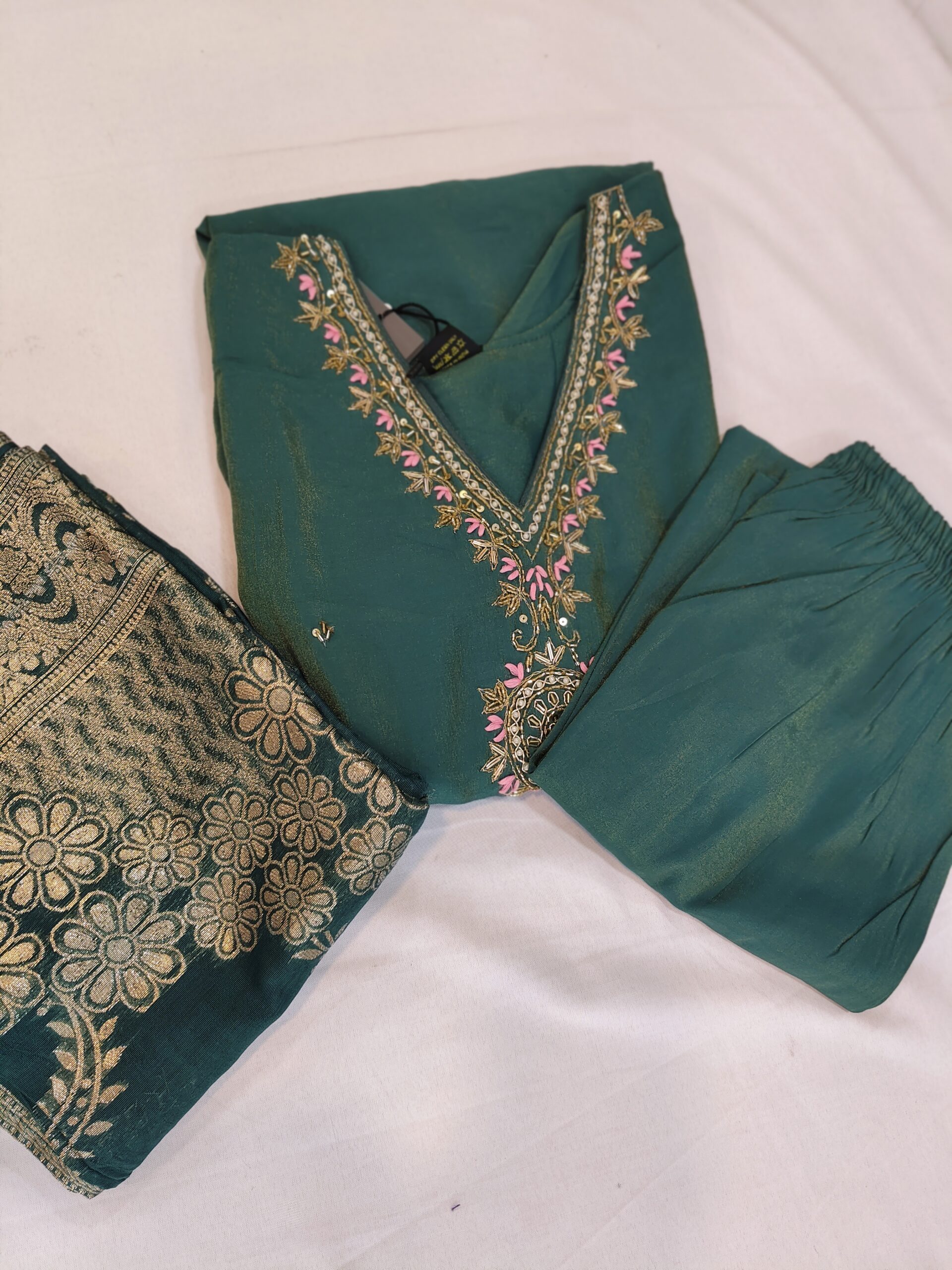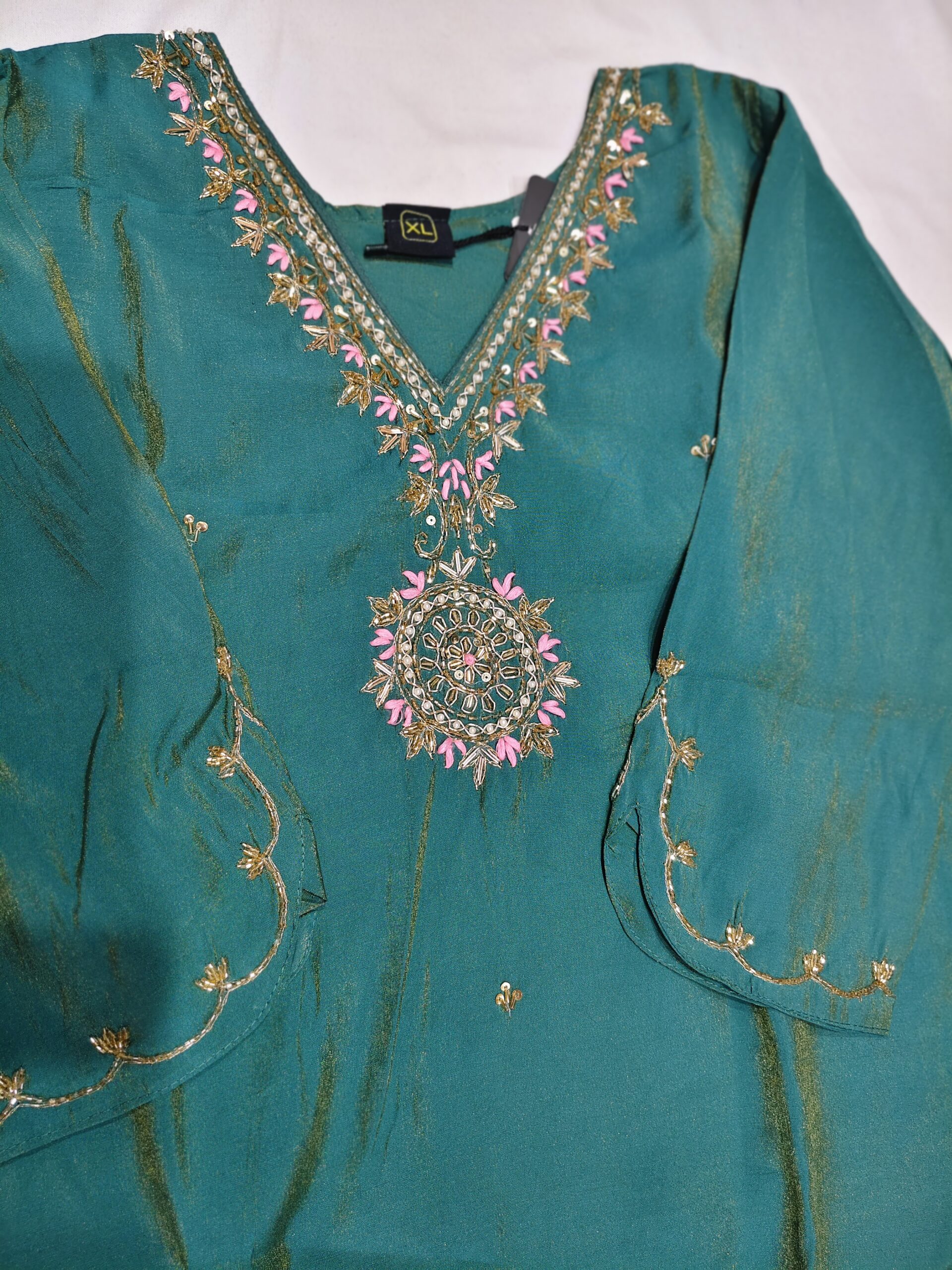 Dark green blue embroidery, V neck, 3/4th sleeve, below knee length Top with straight pants & Embroidery dupatta