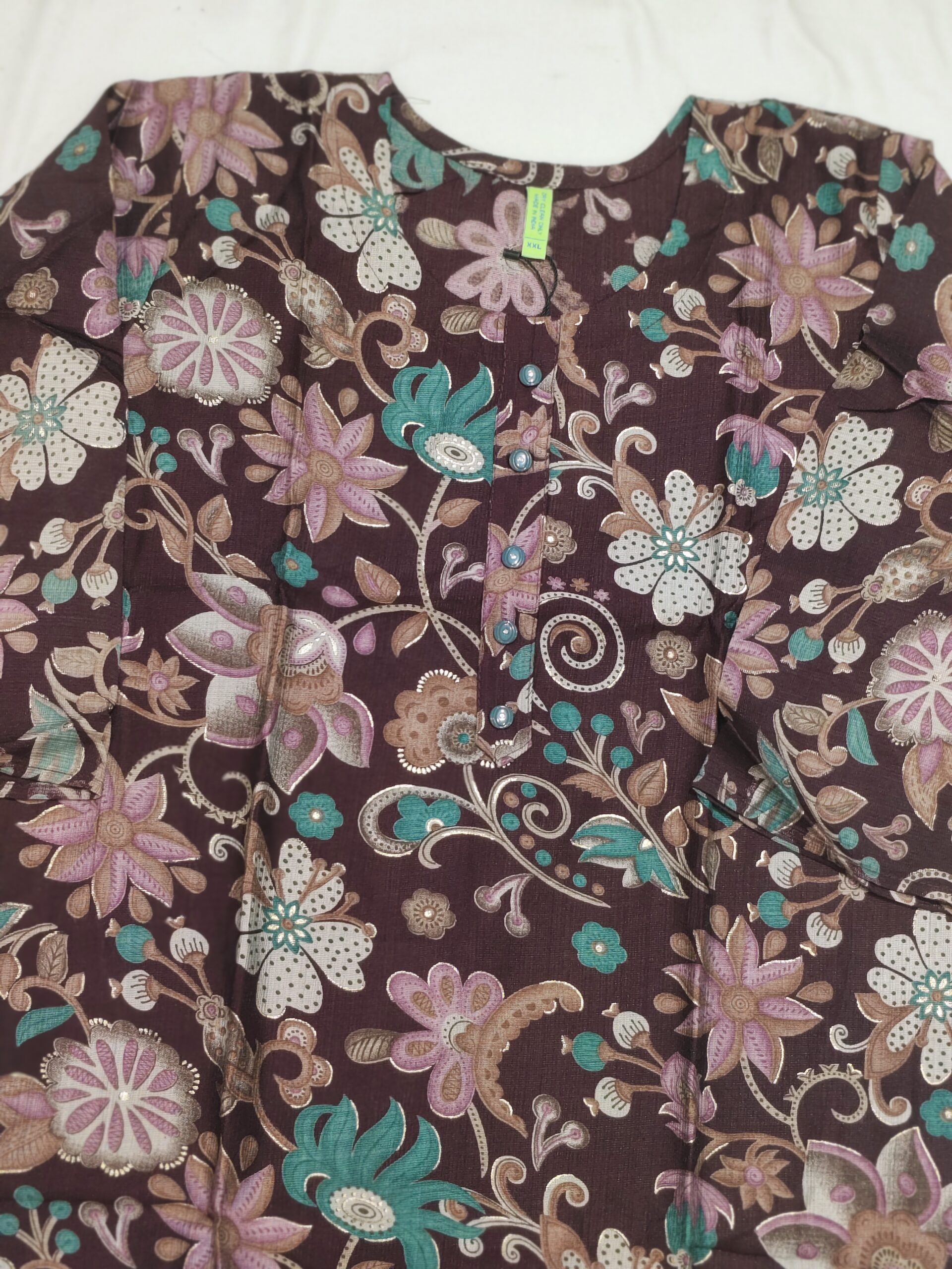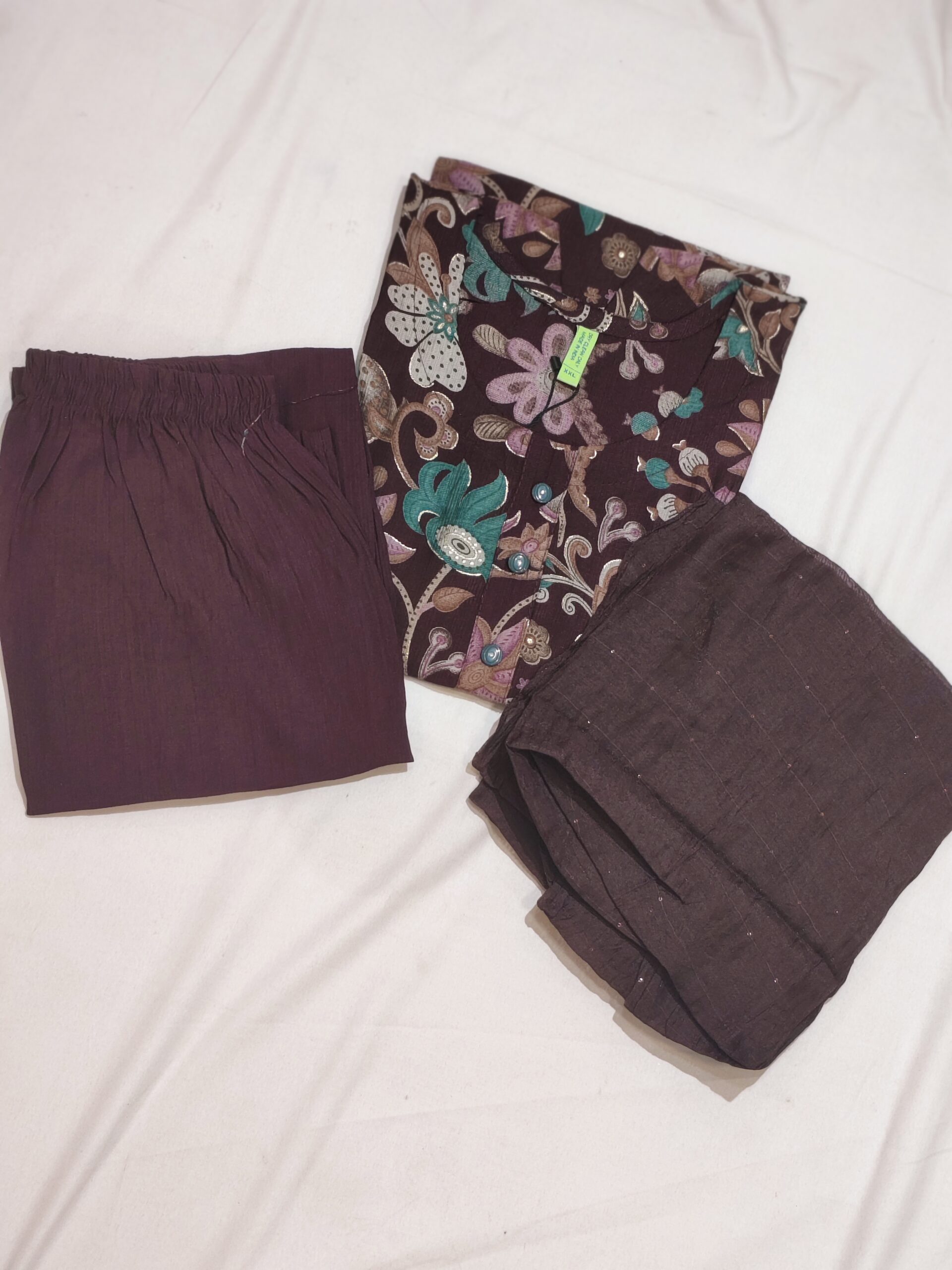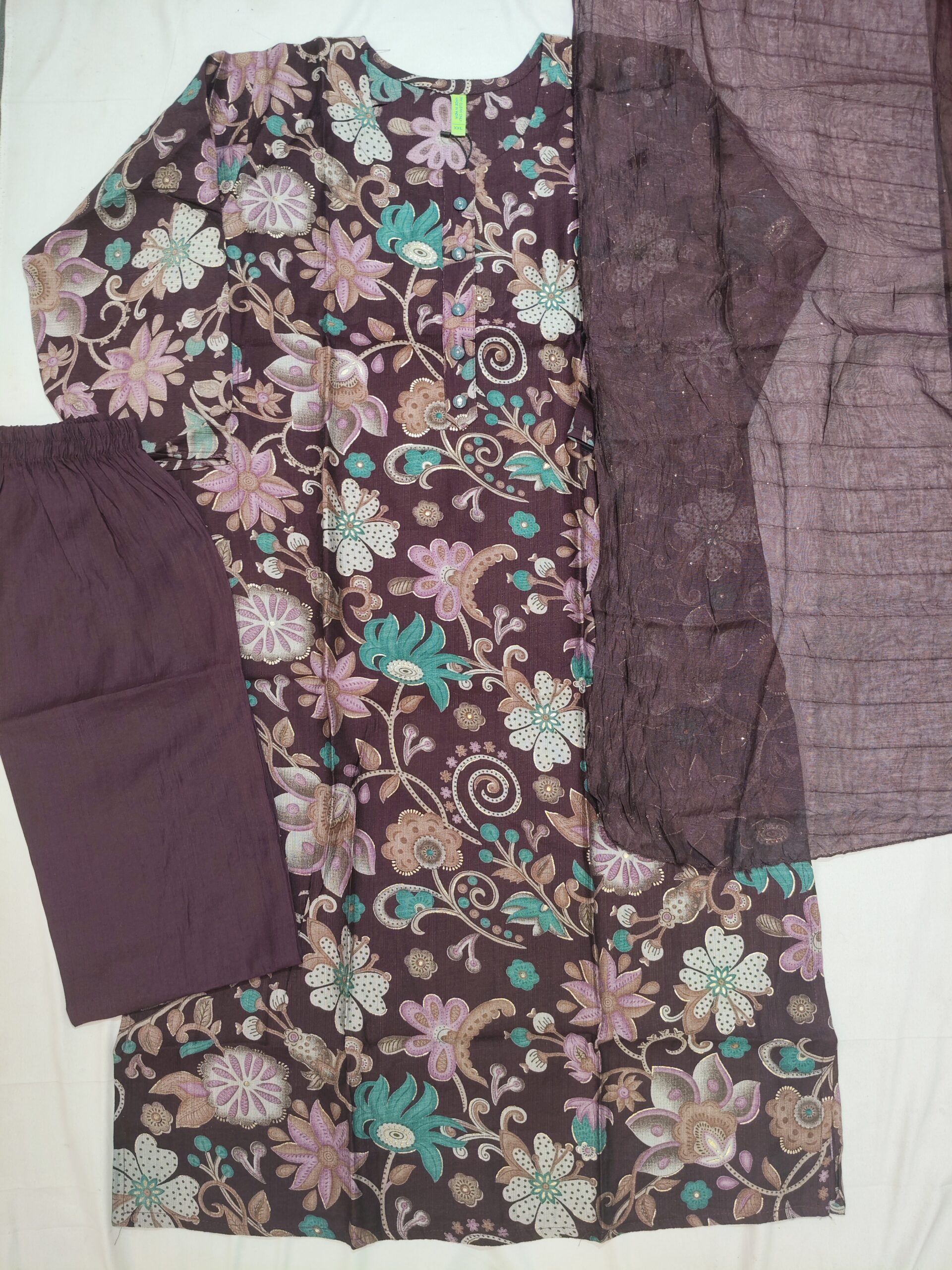 Deep wine floral printed round neck, 3/4th sleeve, below knee length Top with straight pants & dupatta