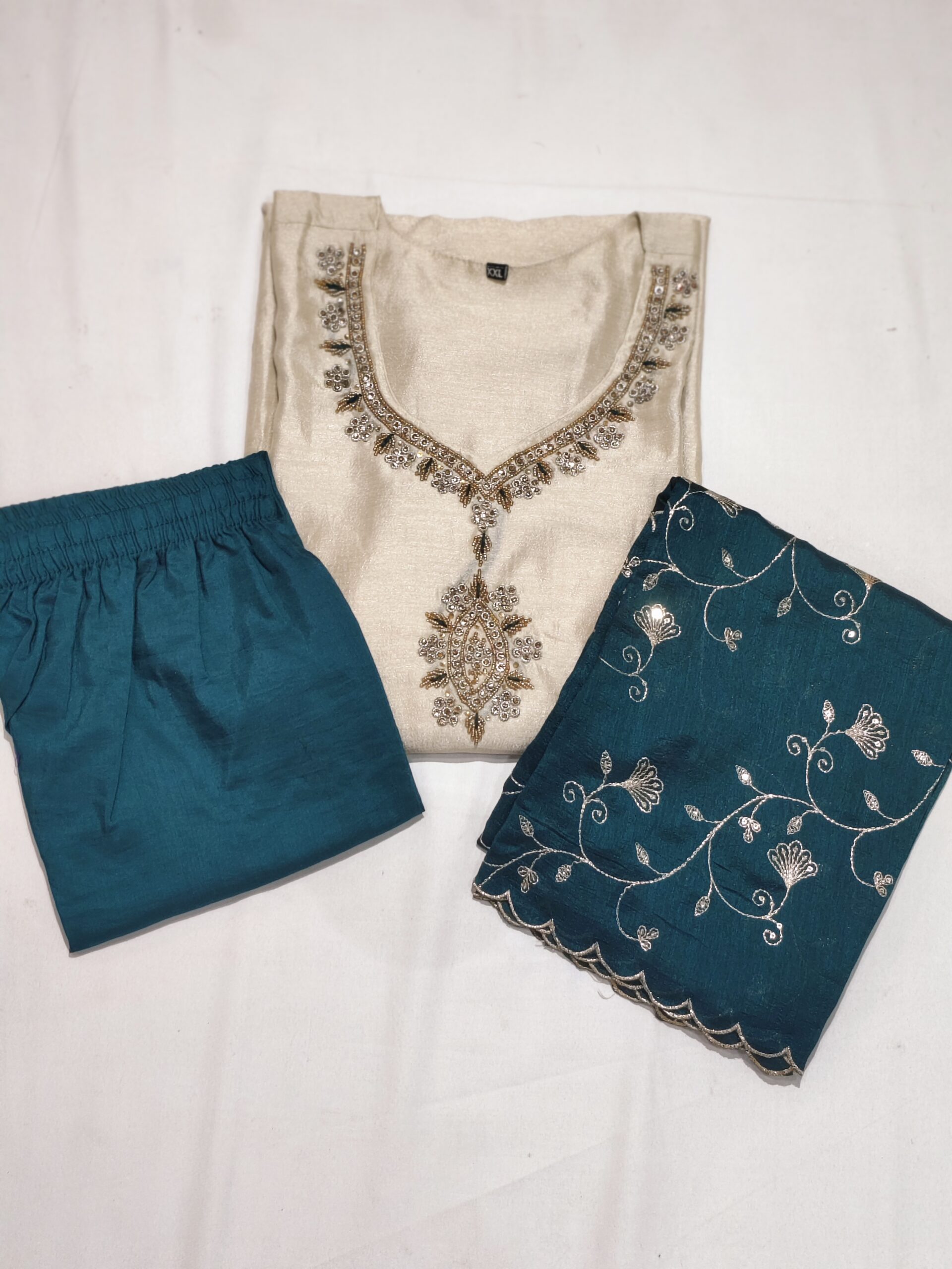Desert sand aari work, V neck, 3/4th sleeve, below knee length Top with straight pants & printed dupatta
