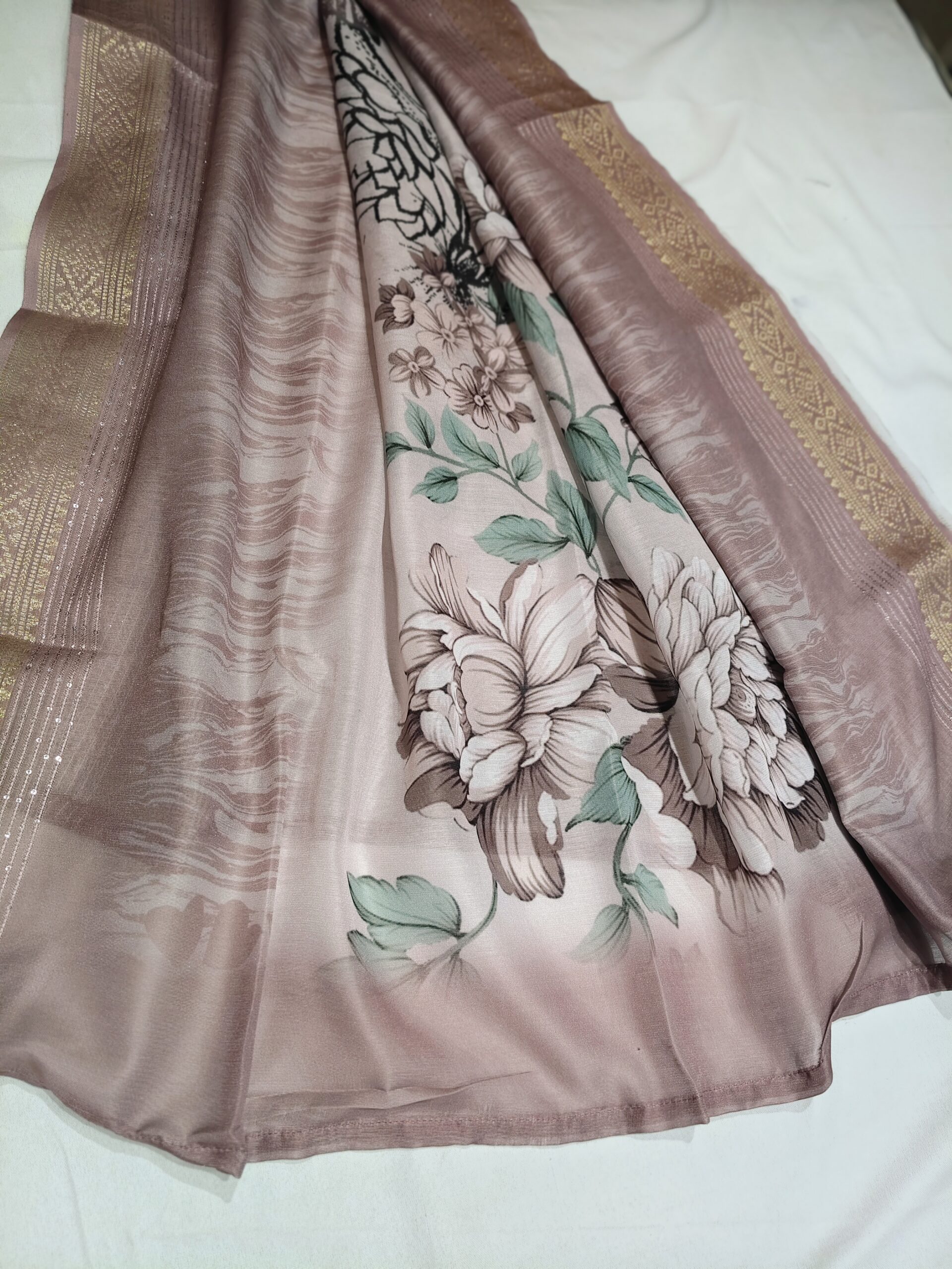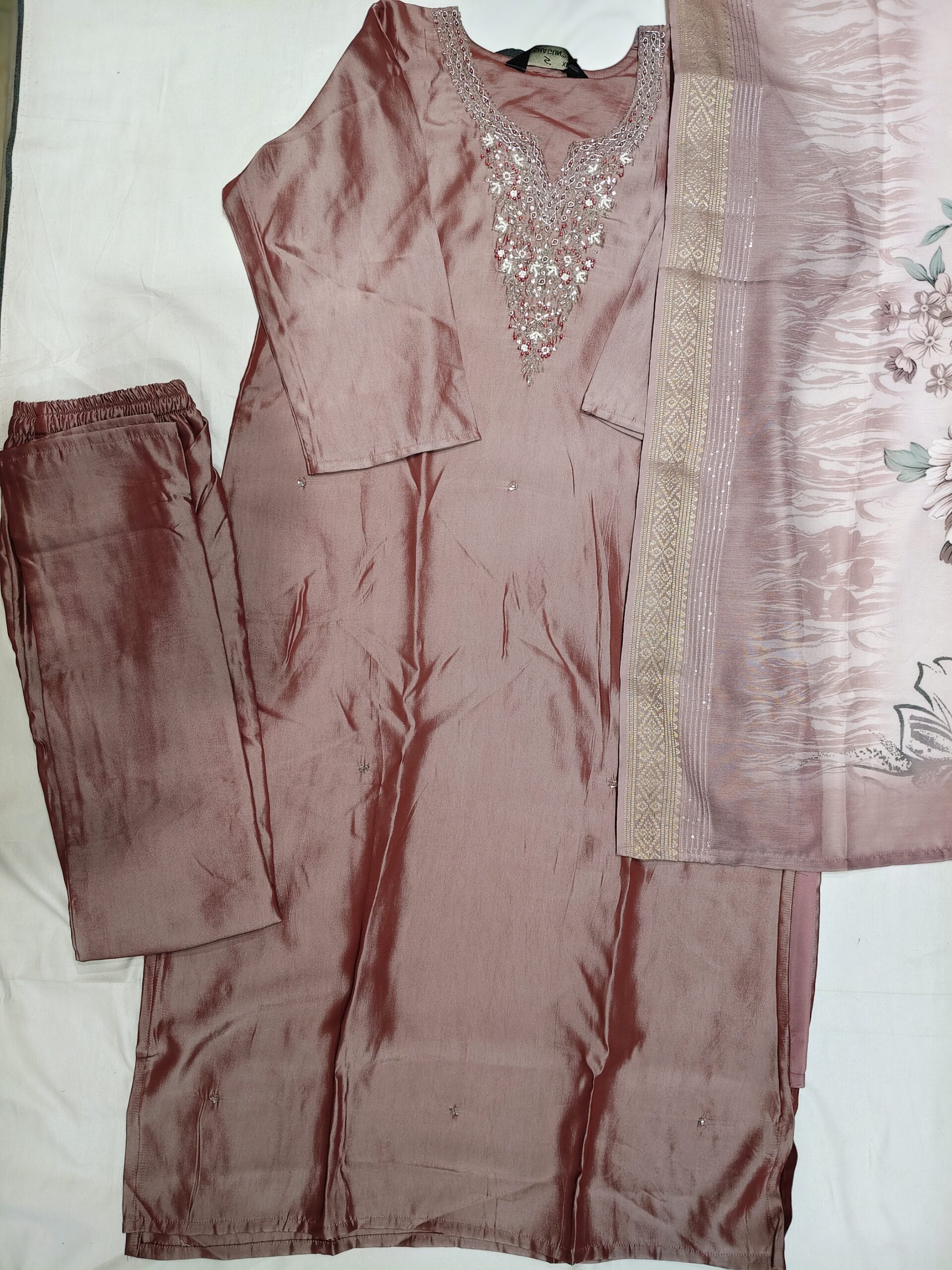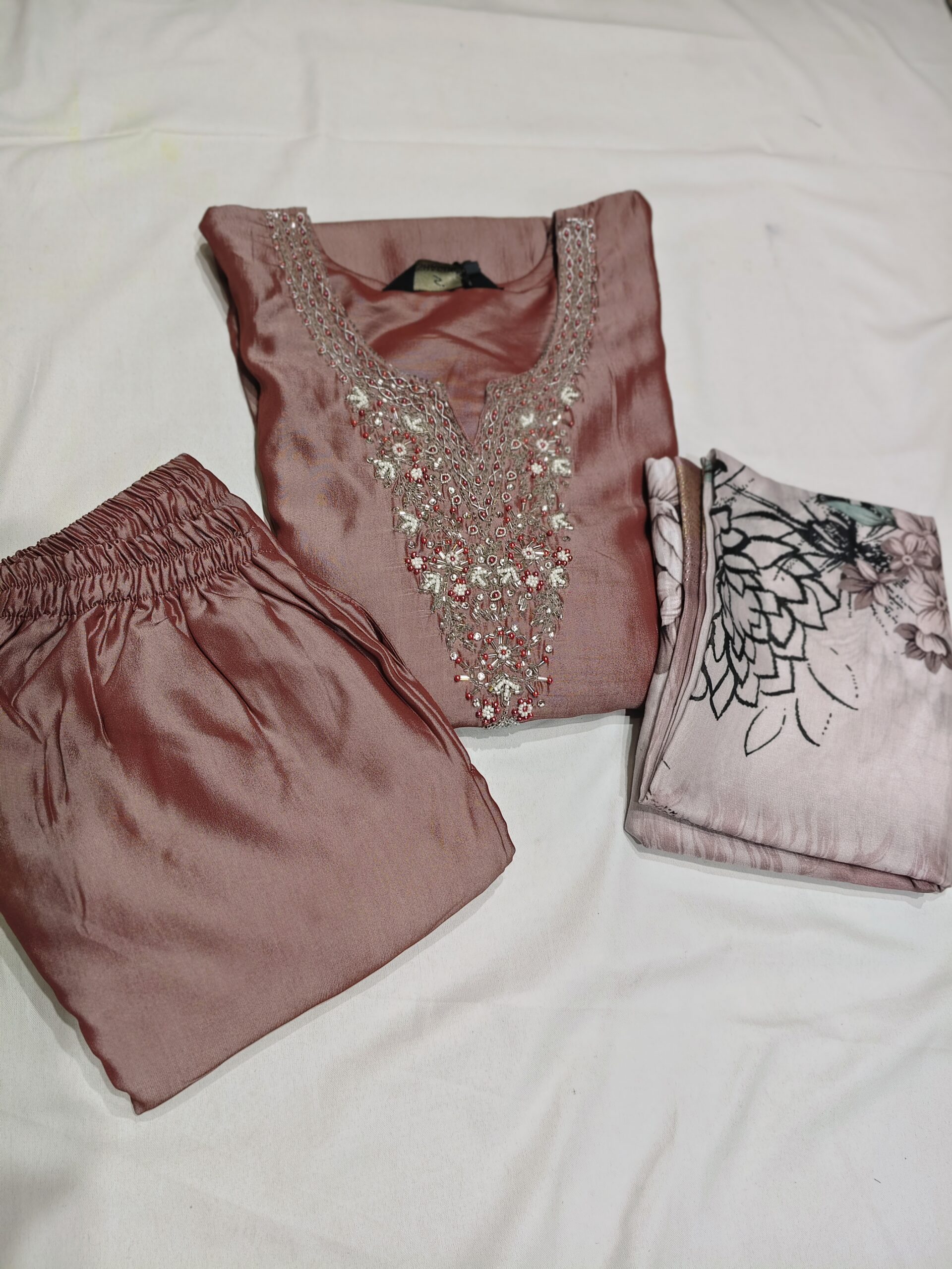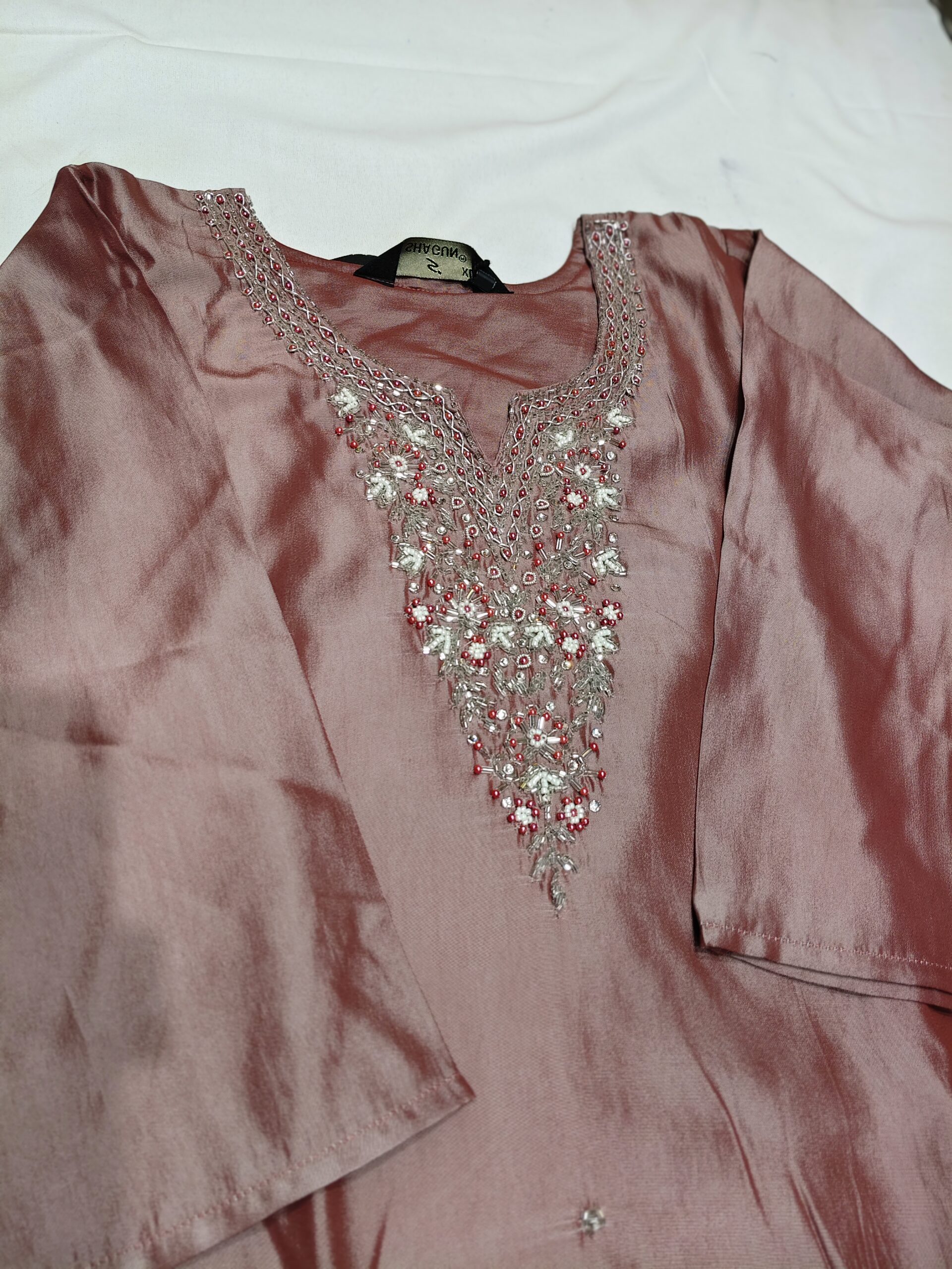 Dusty rose aari work, Round neck, 3/4th sleeve, below knee length Top with straight pants & Printed dupatta