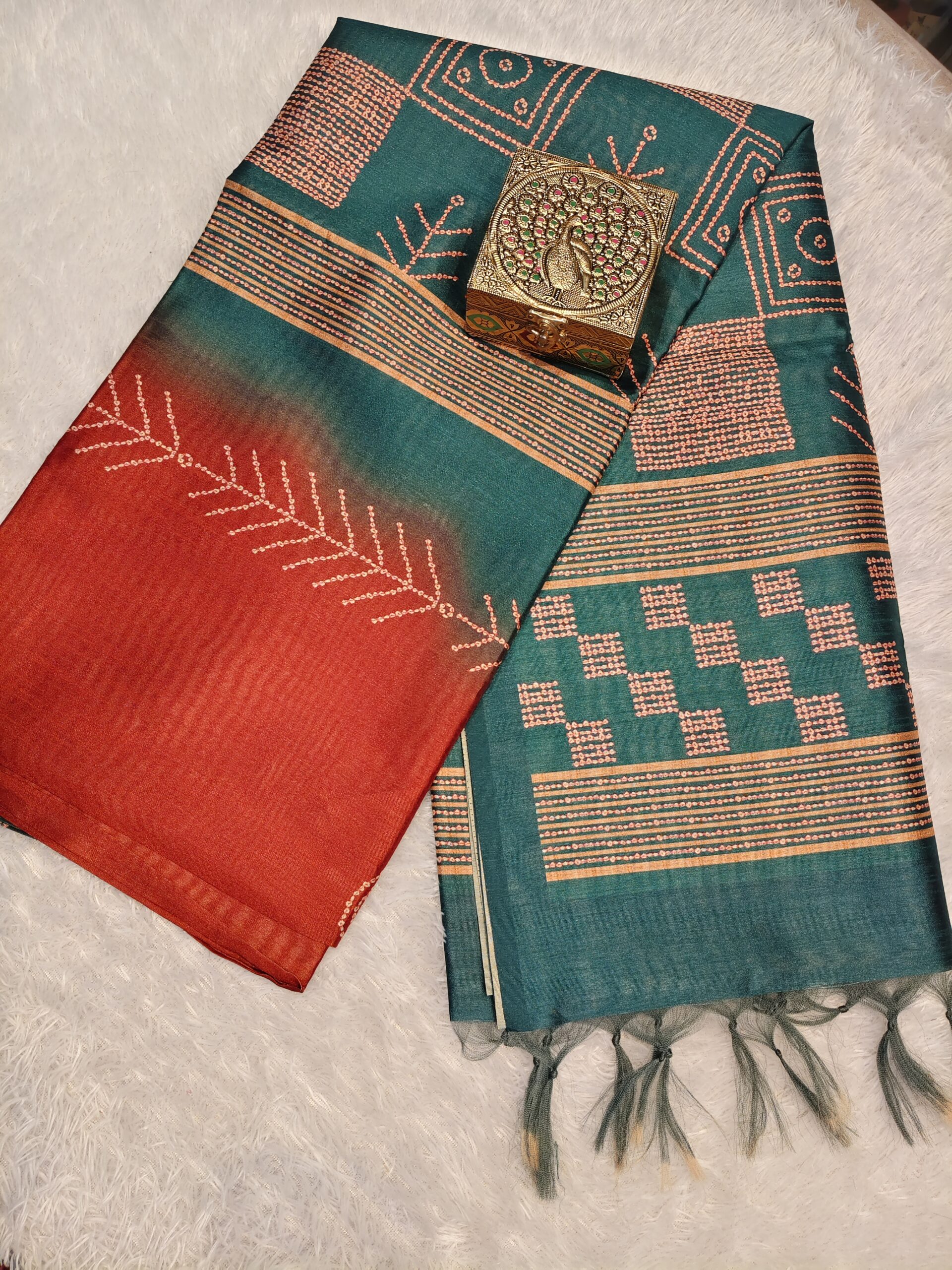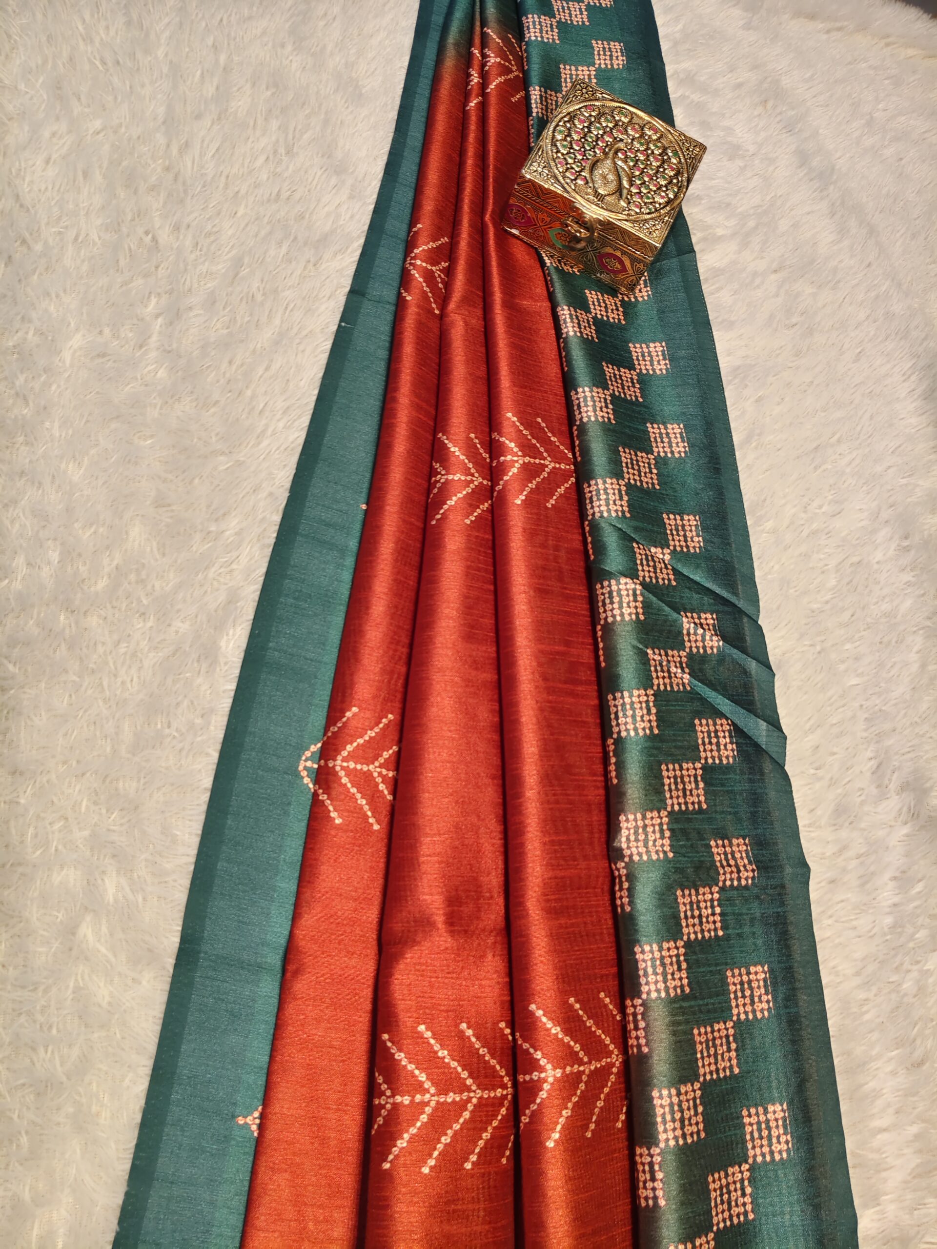 Elevate your ethnic wardrobe with this Soft Tussar Silk Saree, designed to combine traditional artistry with modern elegance. Made from premium-quality Tussar silk, this saree features a rich printed design with tassels, giving it a graceful and luxurious appeal.