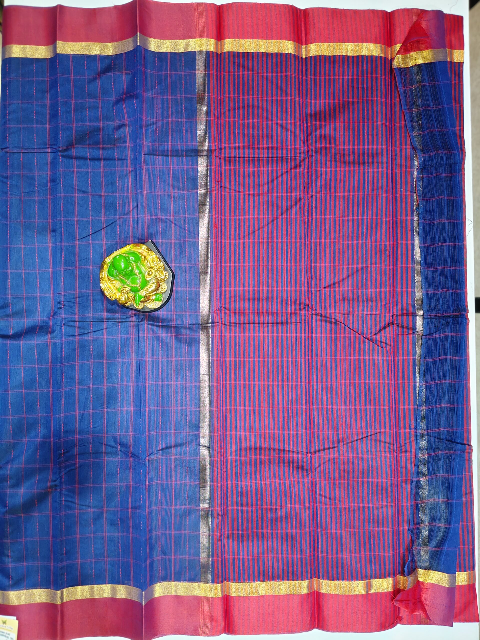 Navy blue with Rose red thread checked body and Rose red plain border with striped pallu.