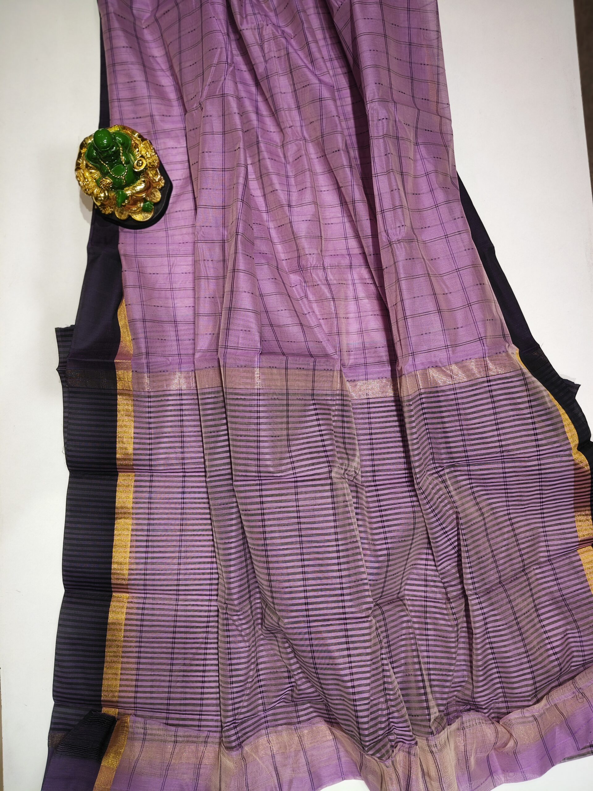 Purplish pink with purple checked body and contrast plain border with striped pallu.