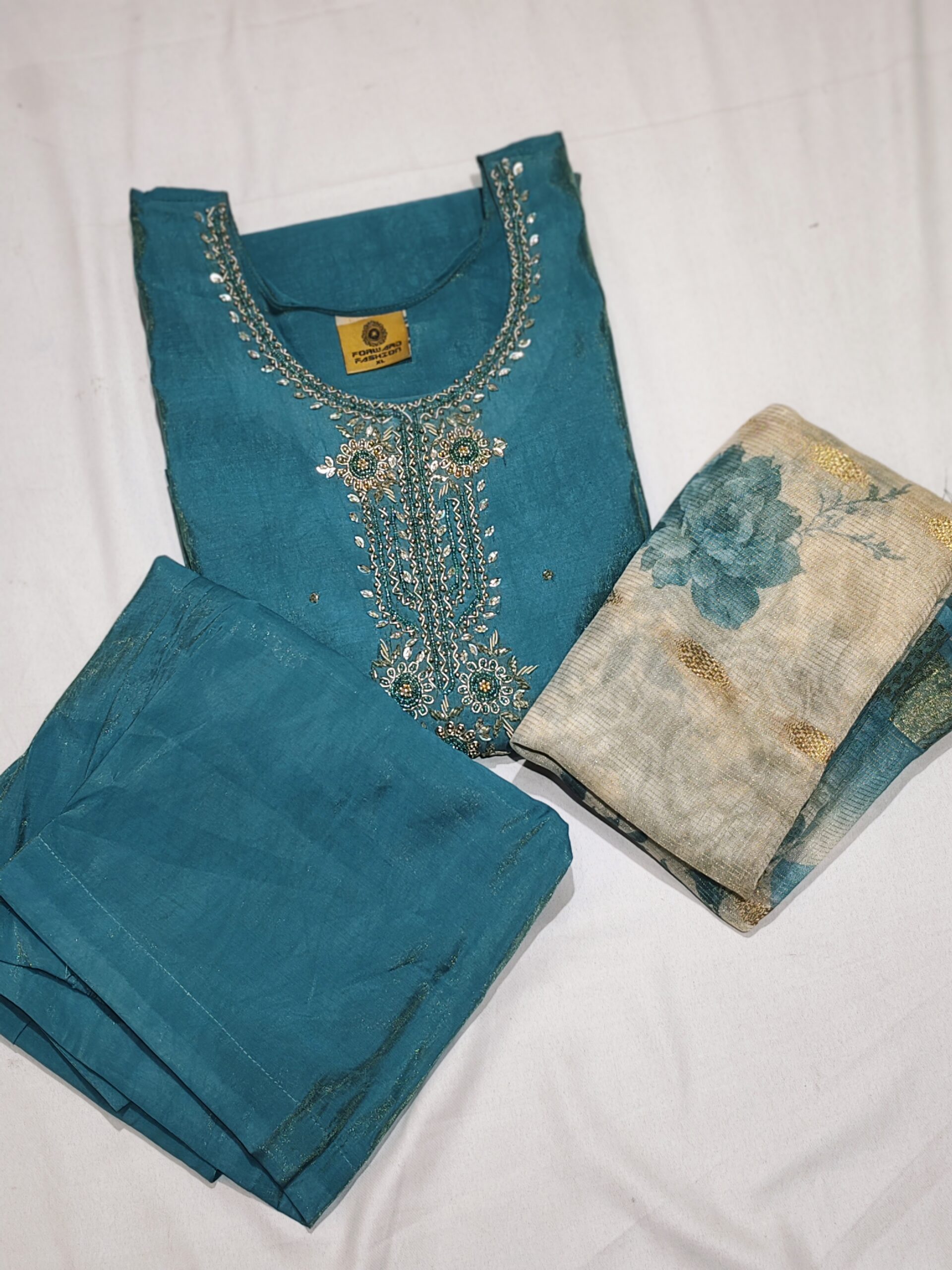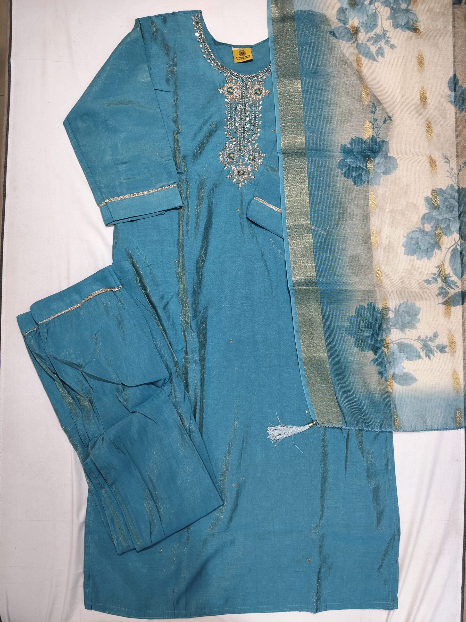 Peacock blue aari work, Round neck, 3/4th sleeve, below knee length Top with straight pants & Printed dupatta