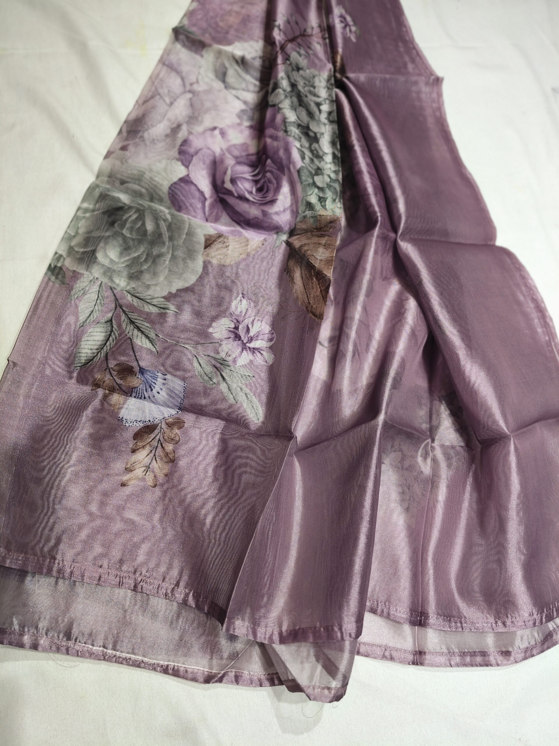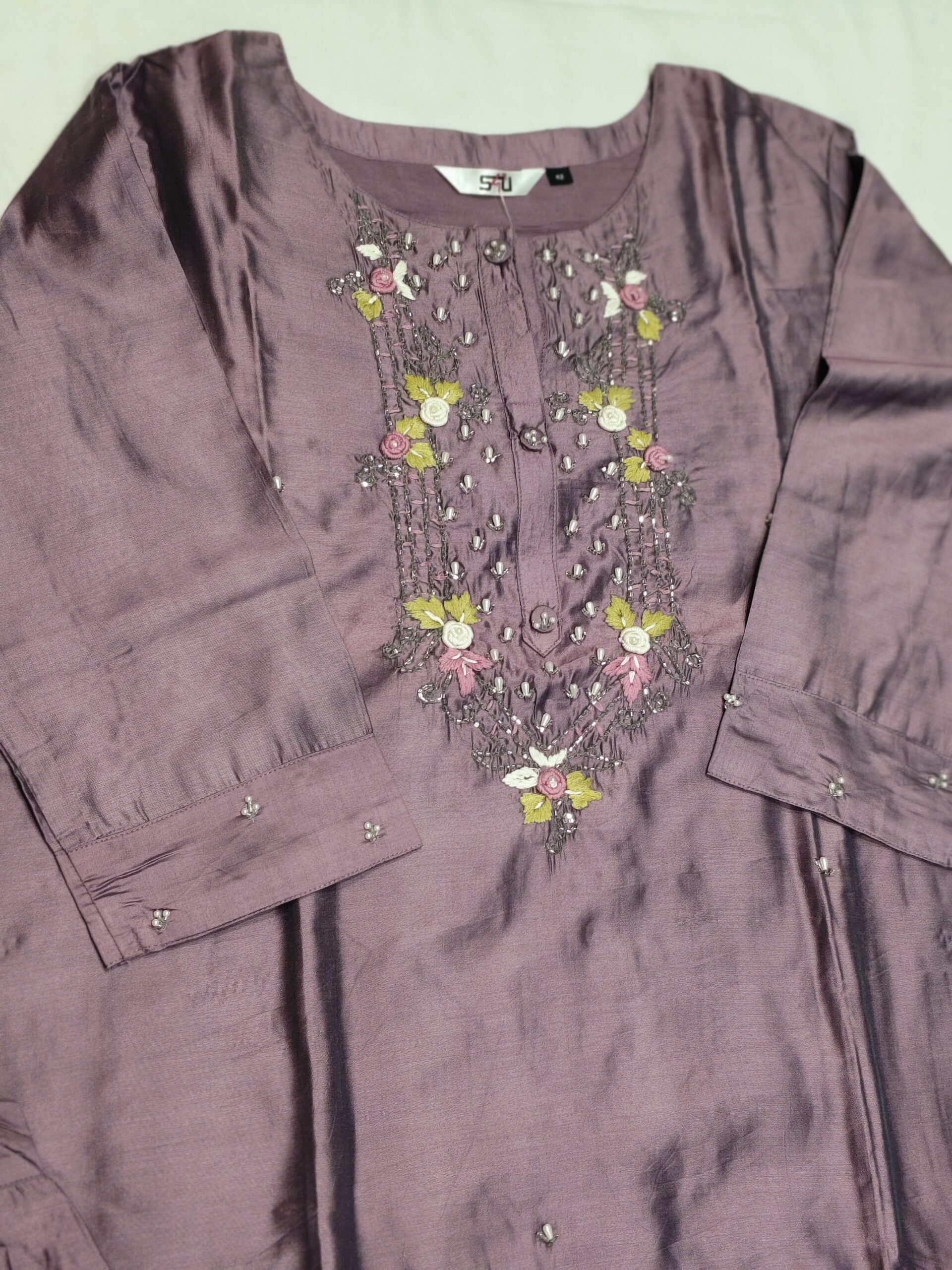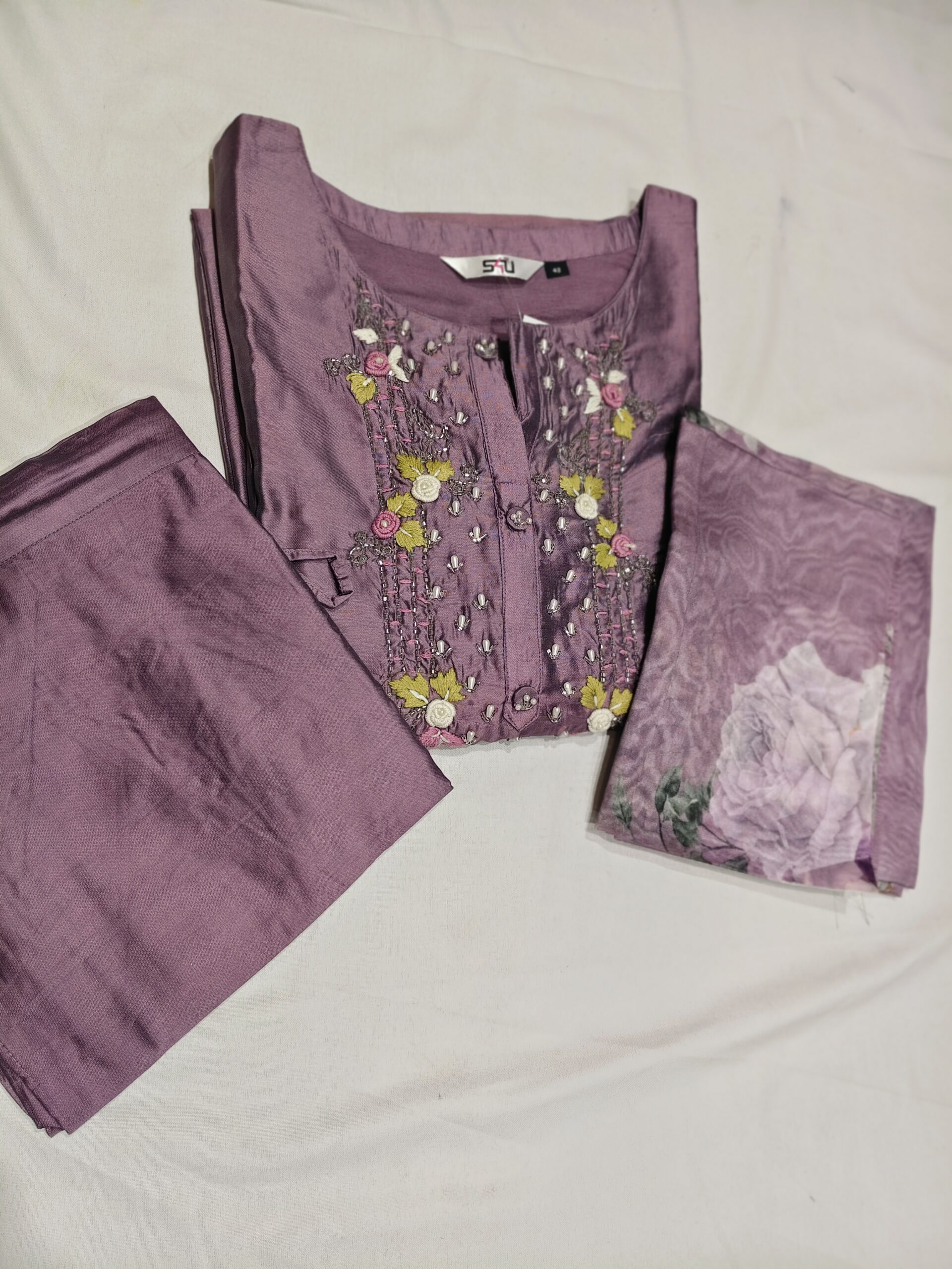 Purple embroidery, Round neck, 3/4th sleeve, below knee length Top with straight pants & Organza dupatta