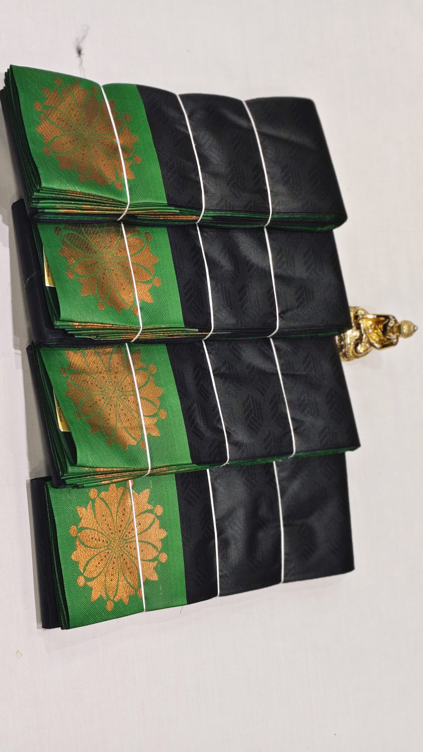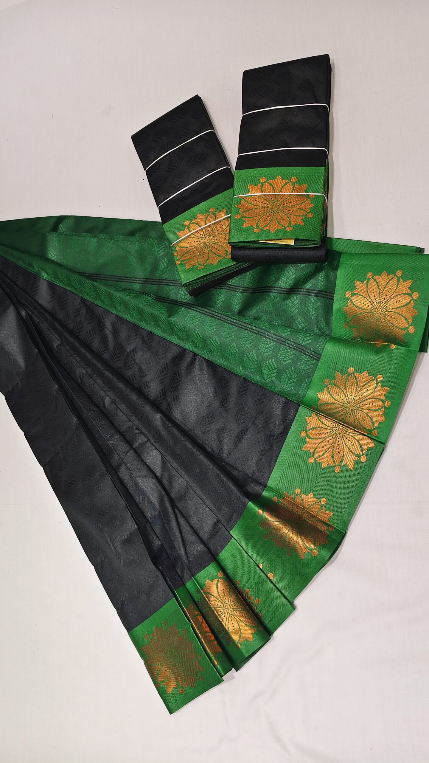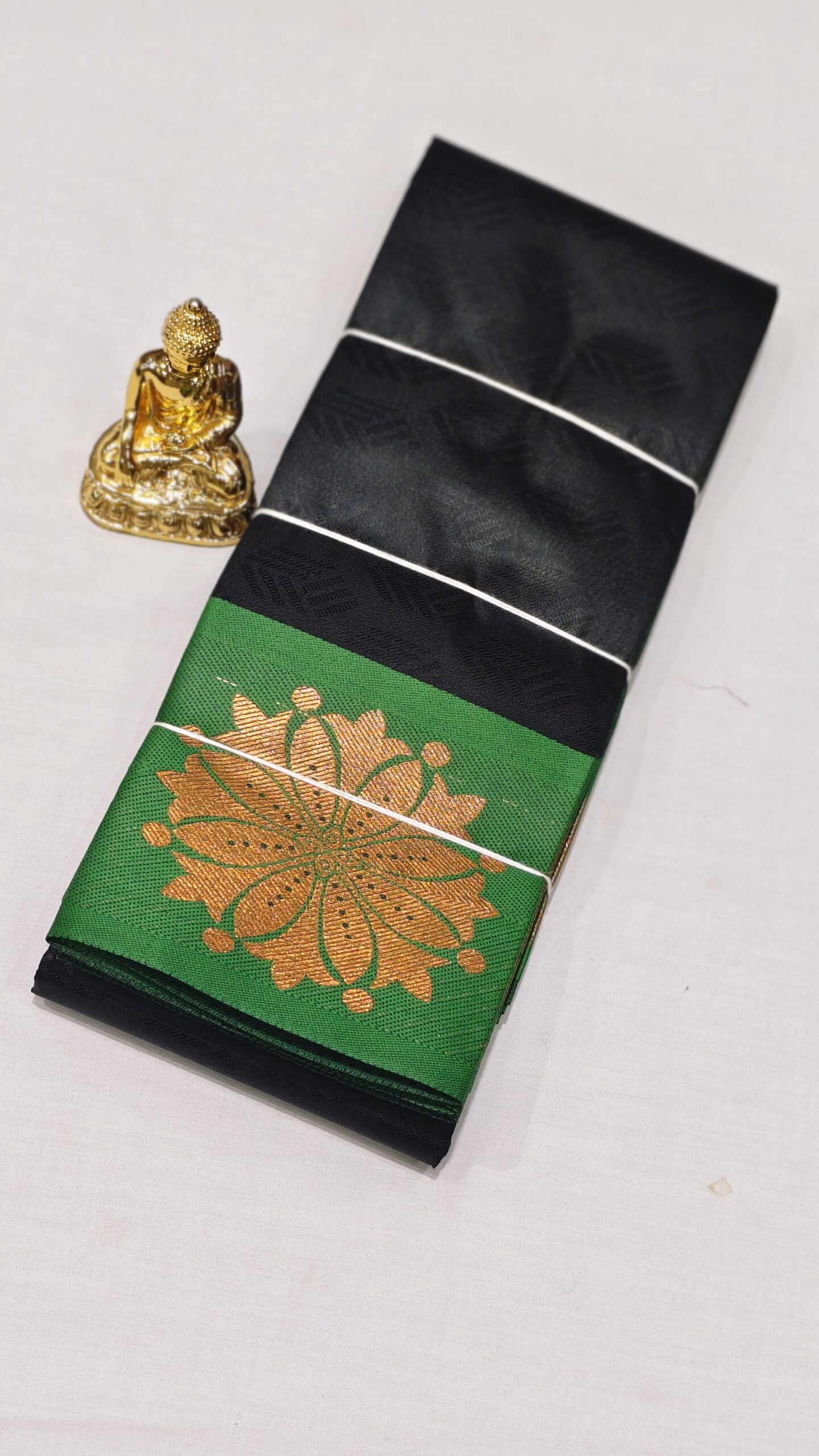 Vibrant Contrast Border: A wide, emerald green border showcases grand, gold-toned floral mandalas that radiate traditional charm.