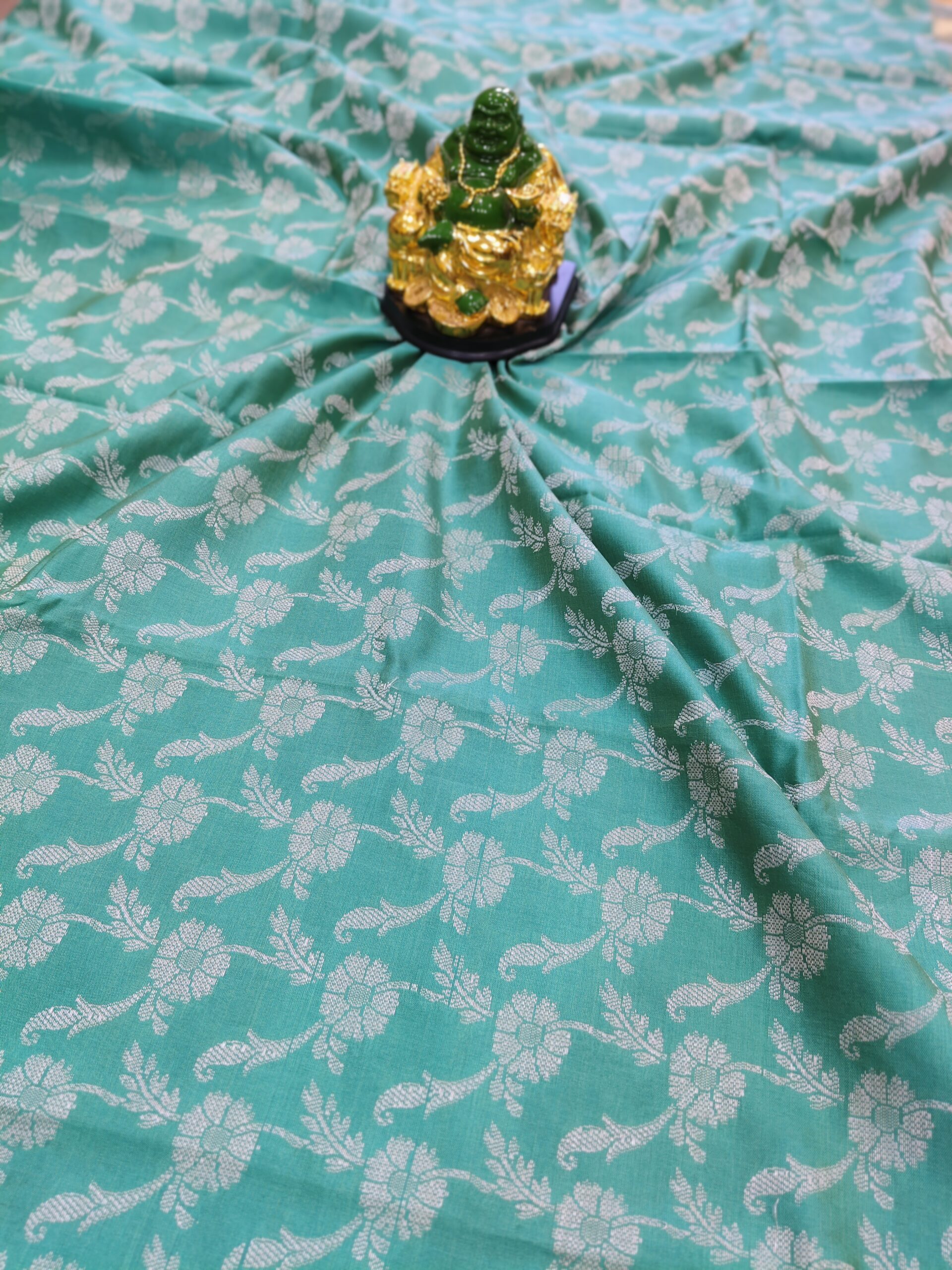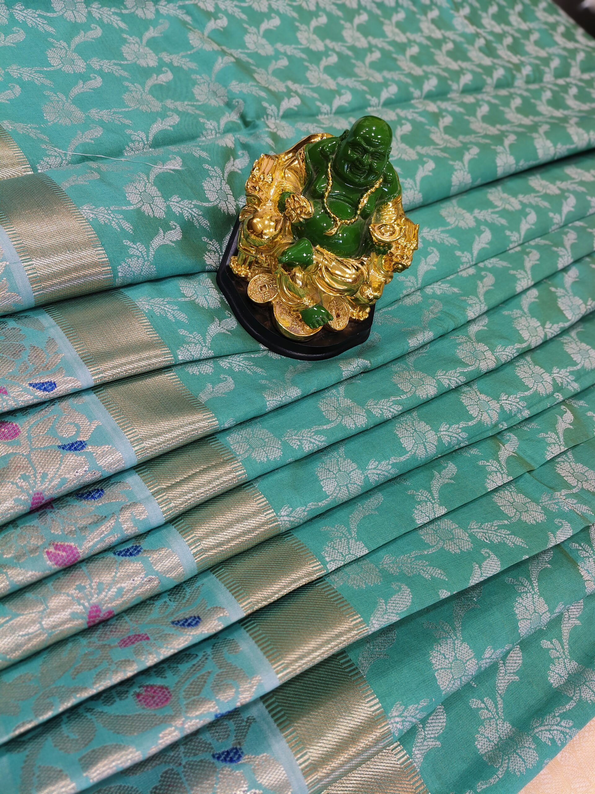 Teal green Soft cotton rich golden zari woven floral design saree with golden zari border