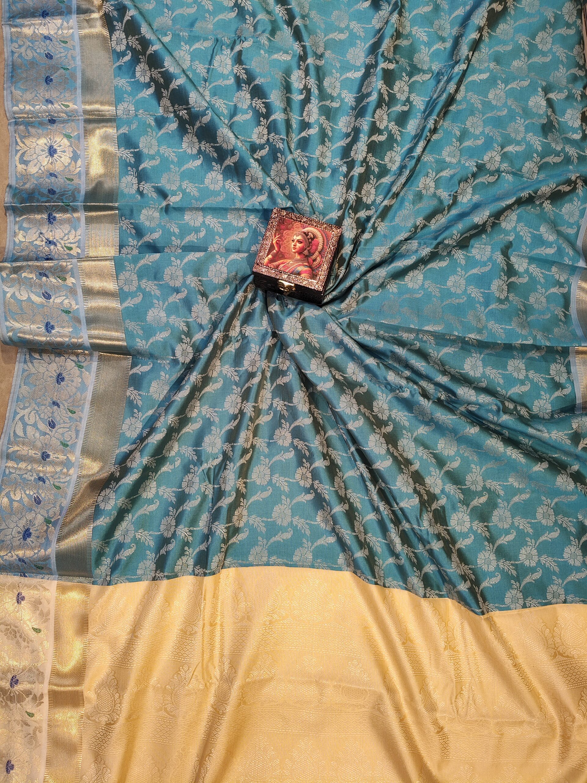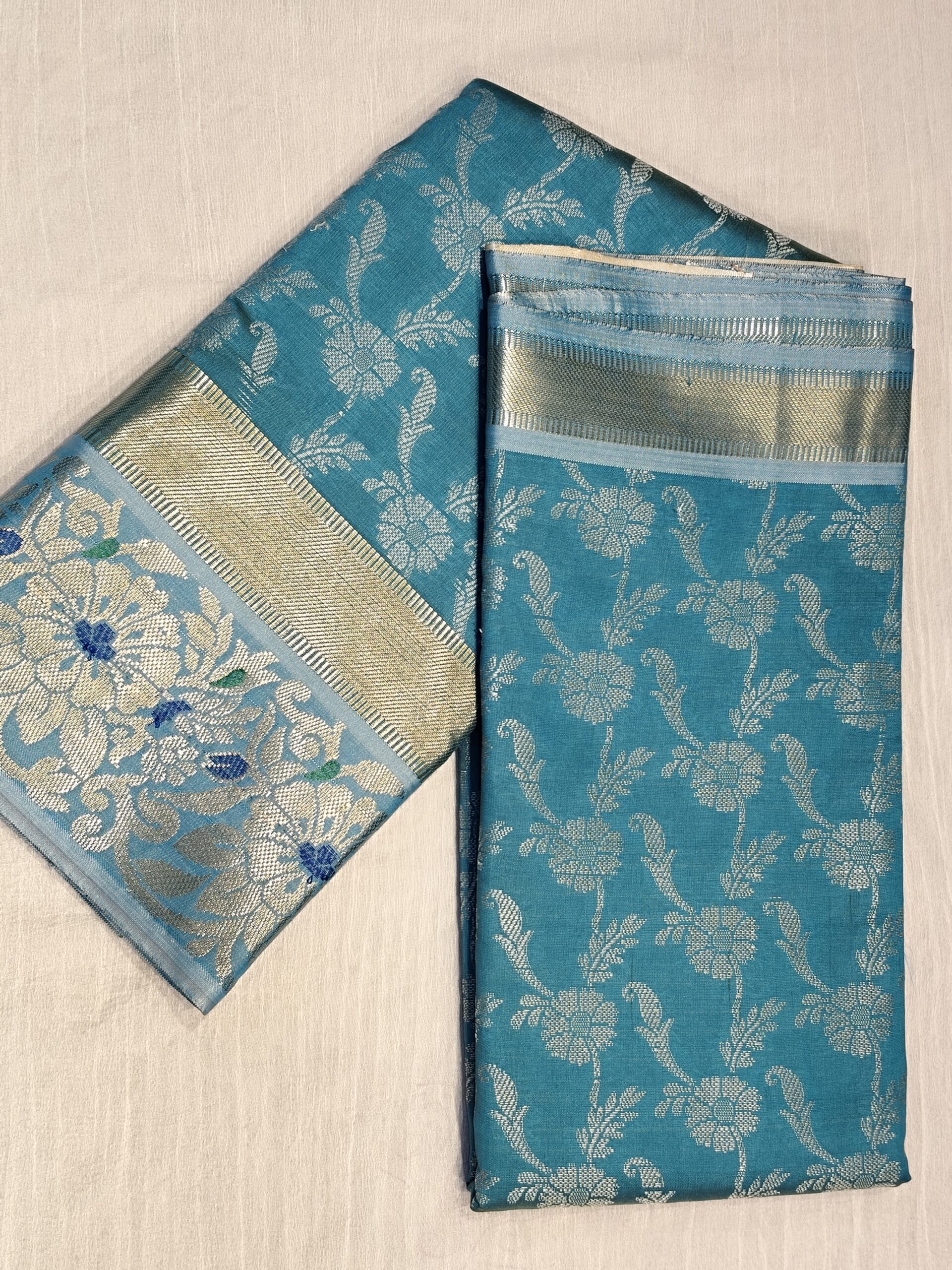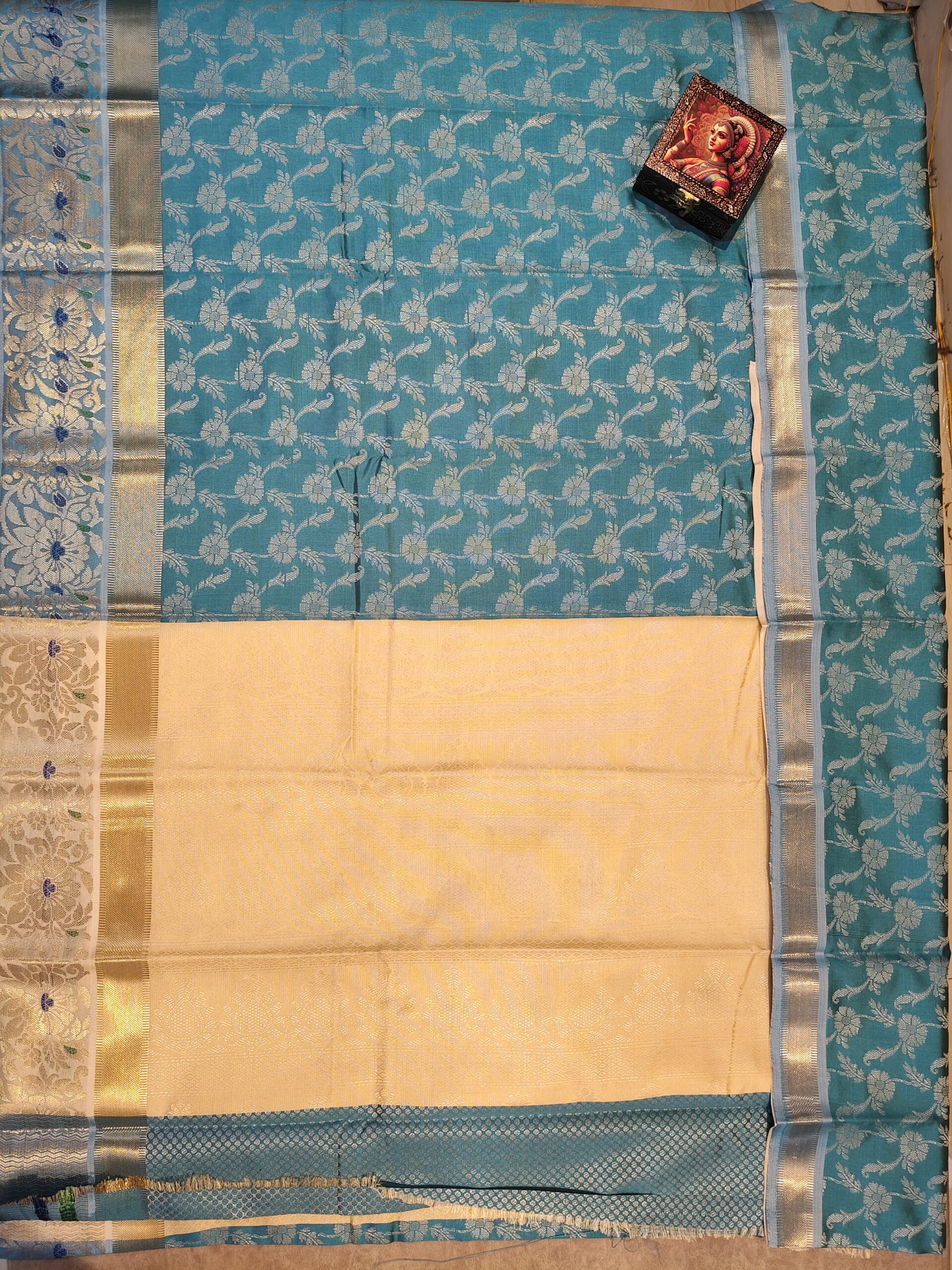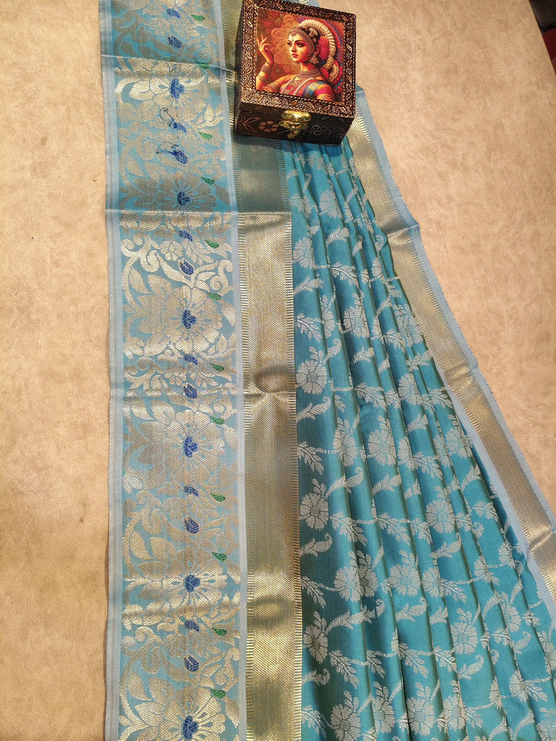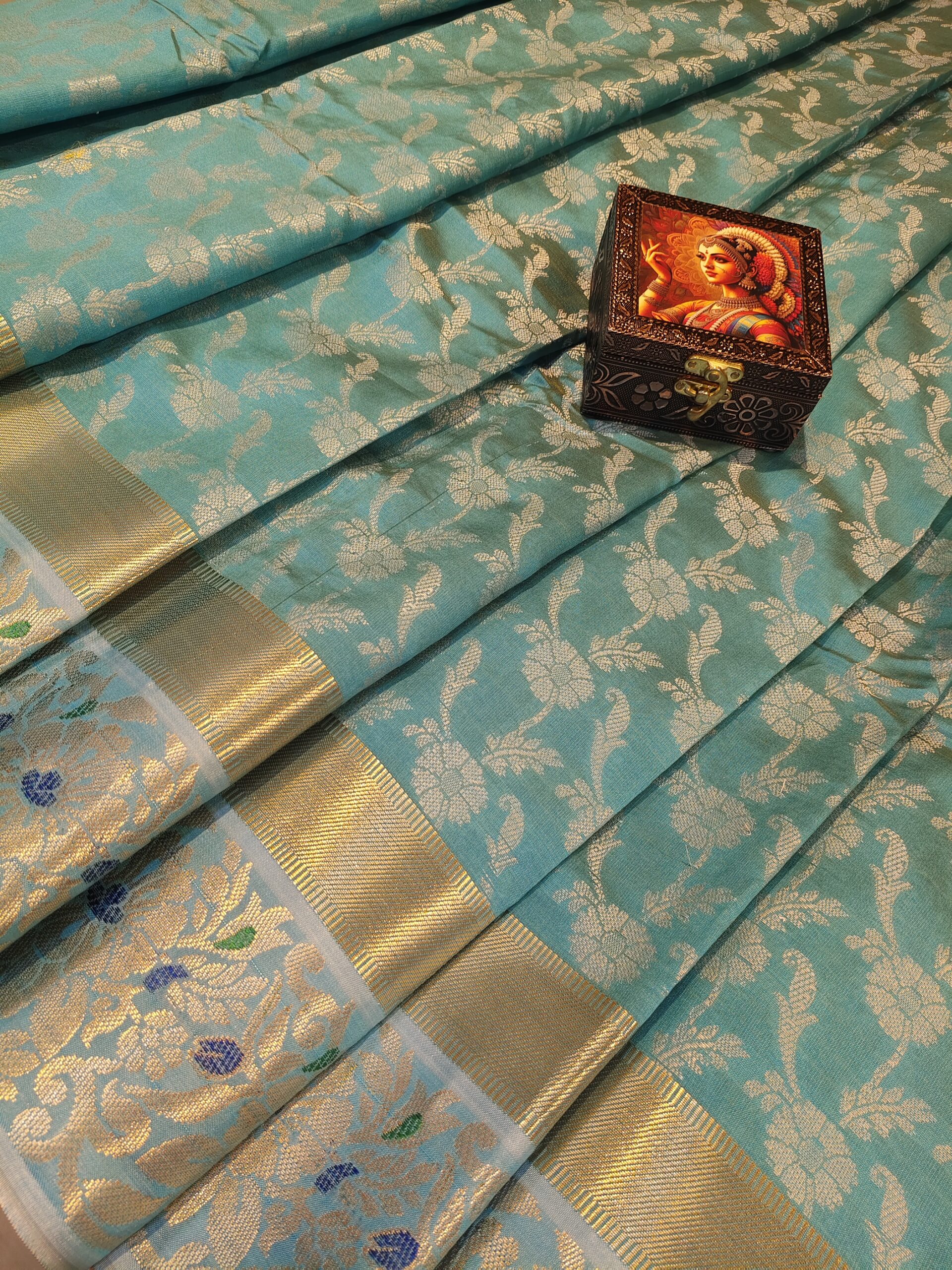 Ocean blue Soft cotton rich golden zari woven floral design saree with golden zari border