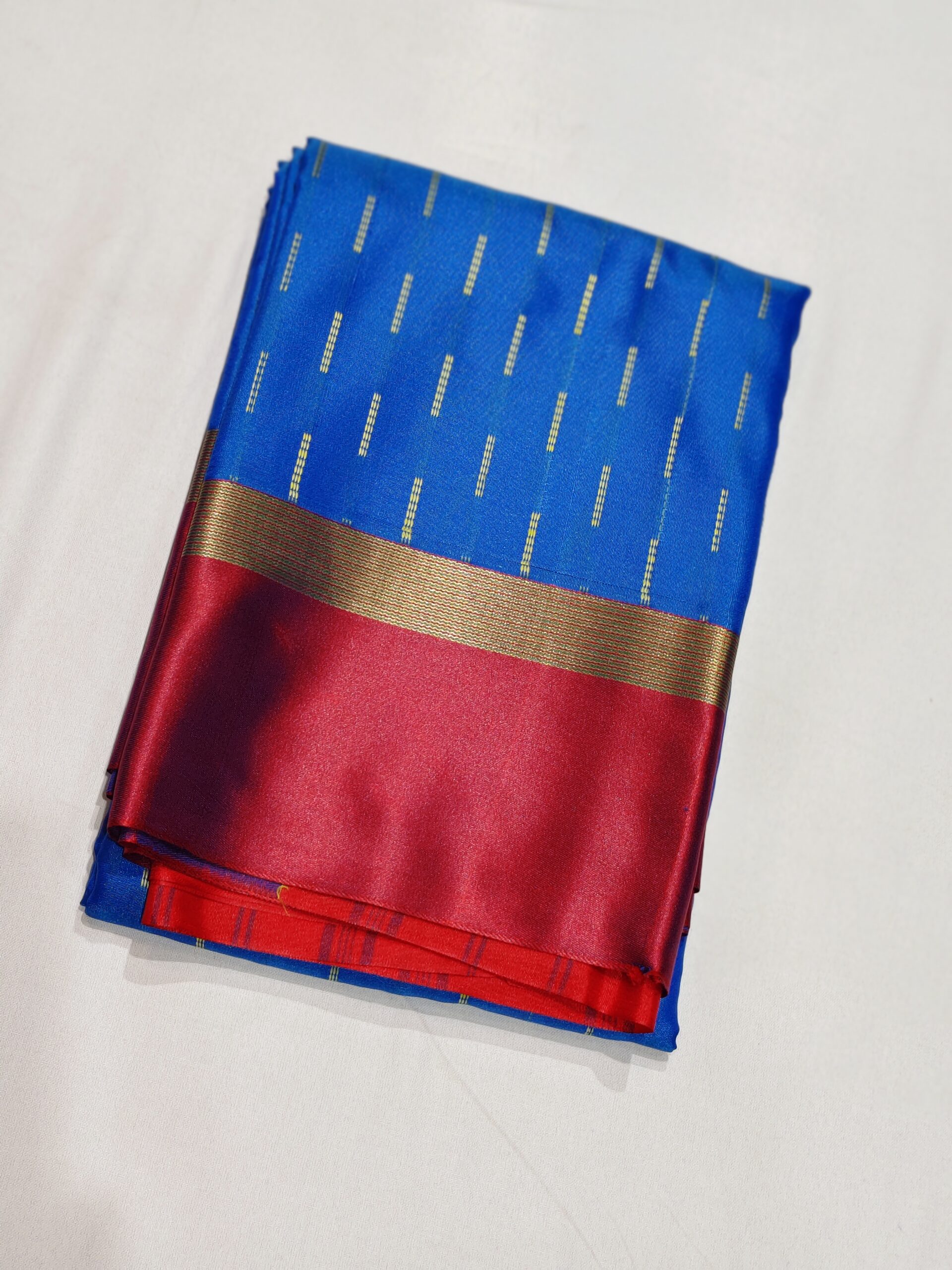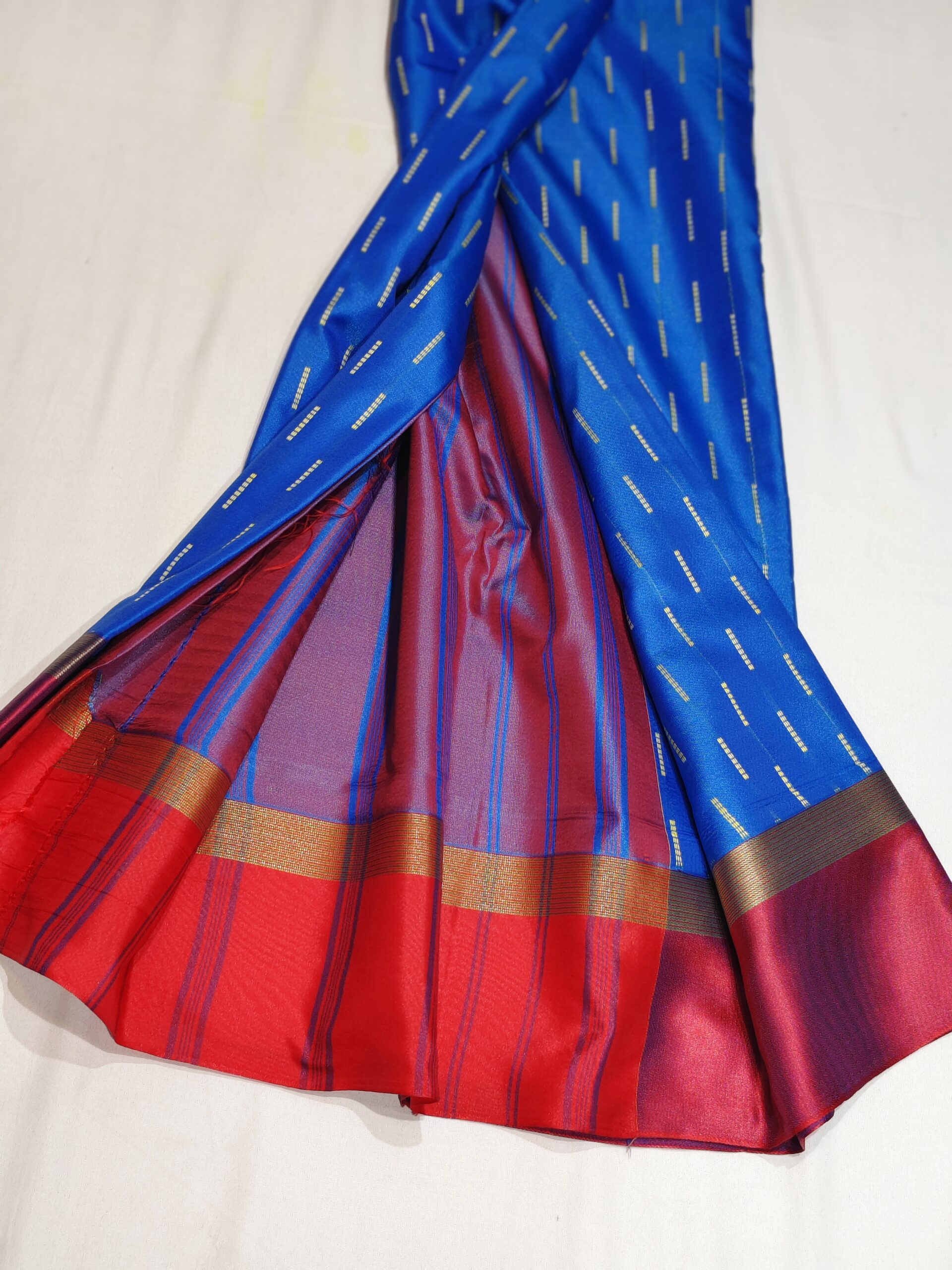 Navu blue body with golden thread stripes and a rich red-brown contrast satin border with striped pallu.