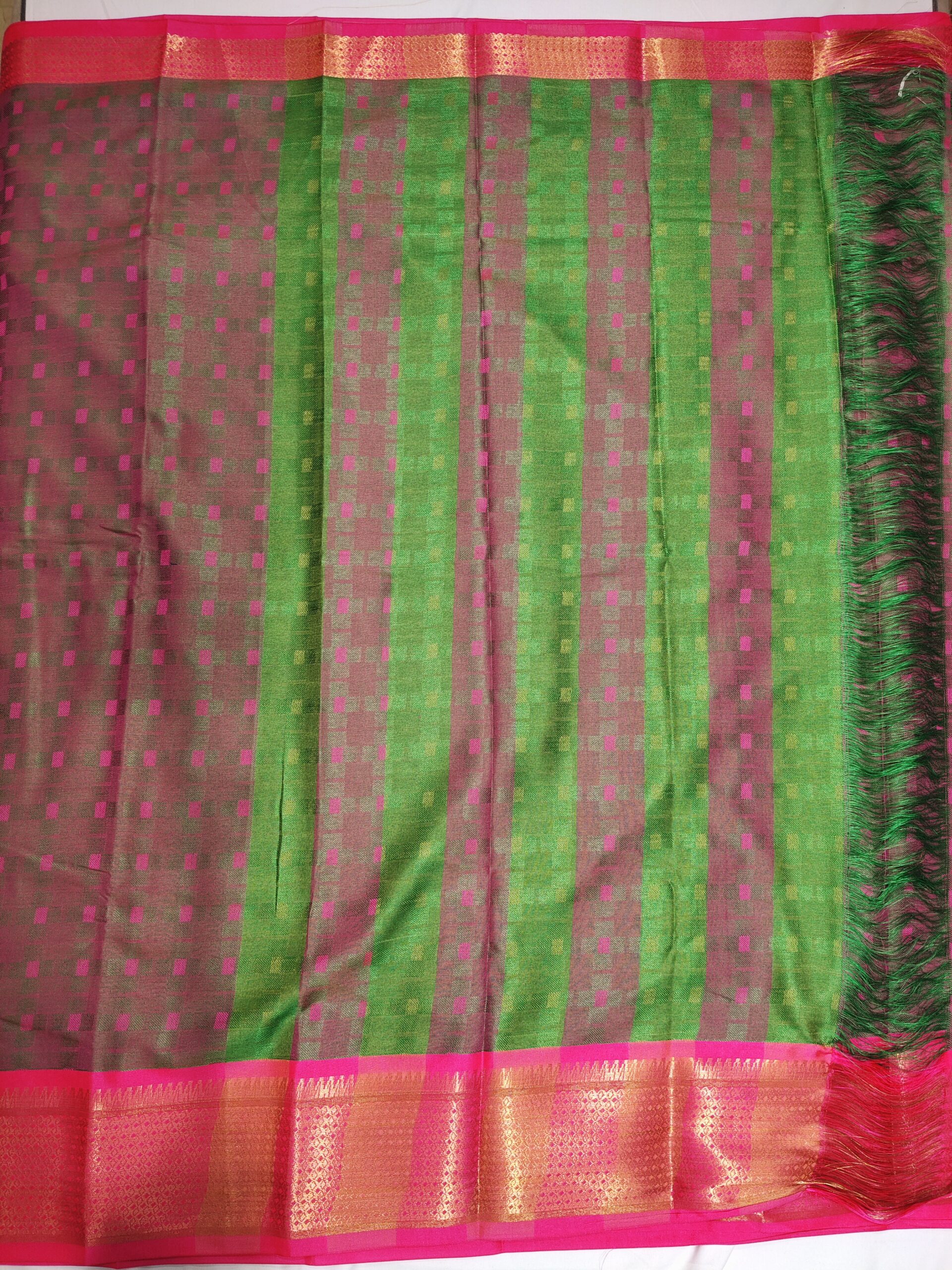 Green & pink Soft cotton rich thread woven checked design saree & Golden zari border