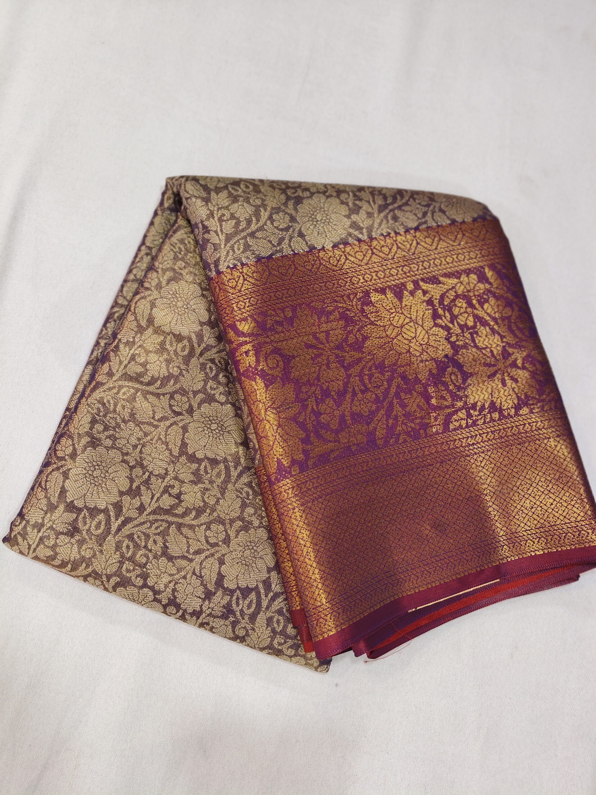 Pastel Brown floral design Soft Tissue Saree with grant zari border, intricate pallu and contrast zari design blouse