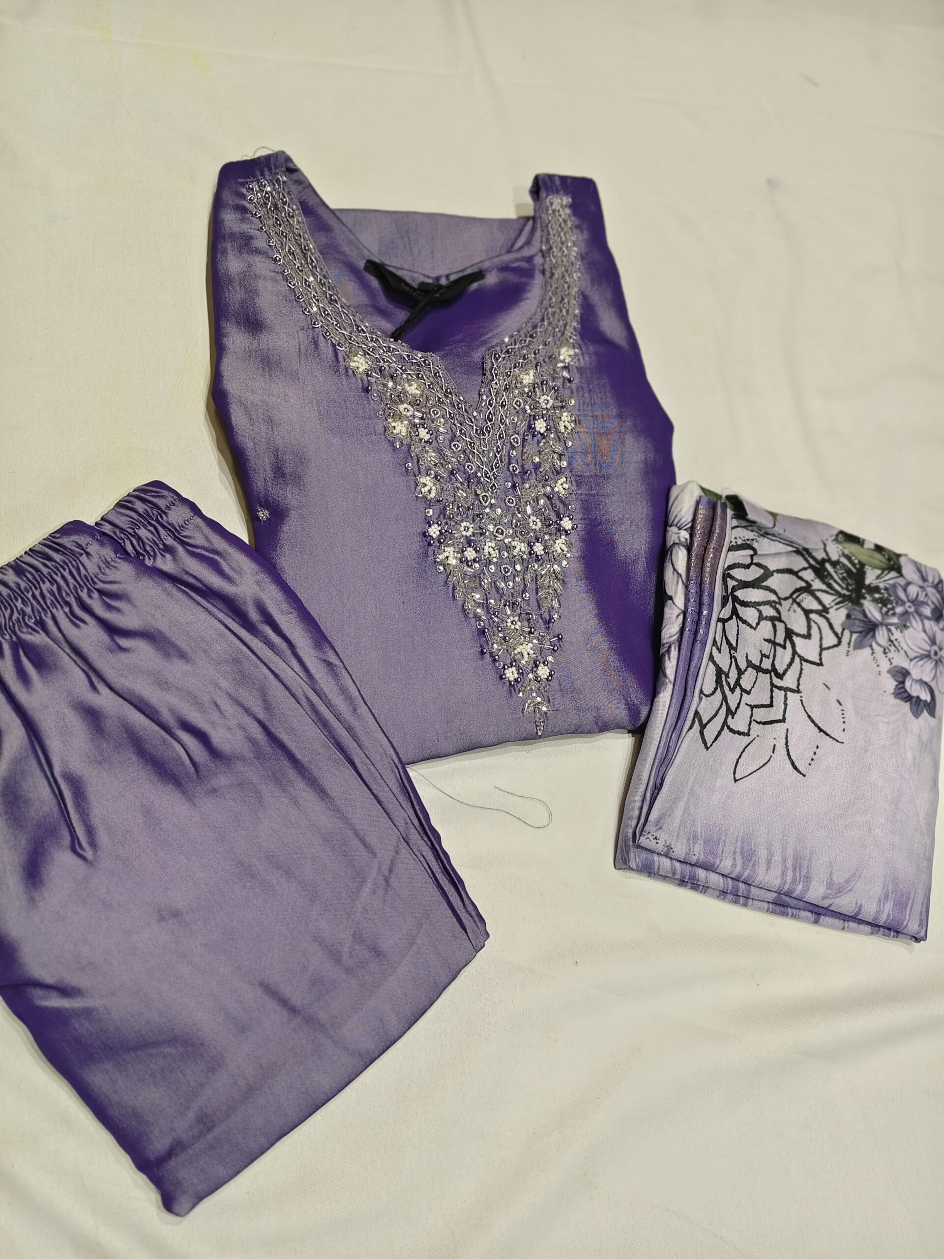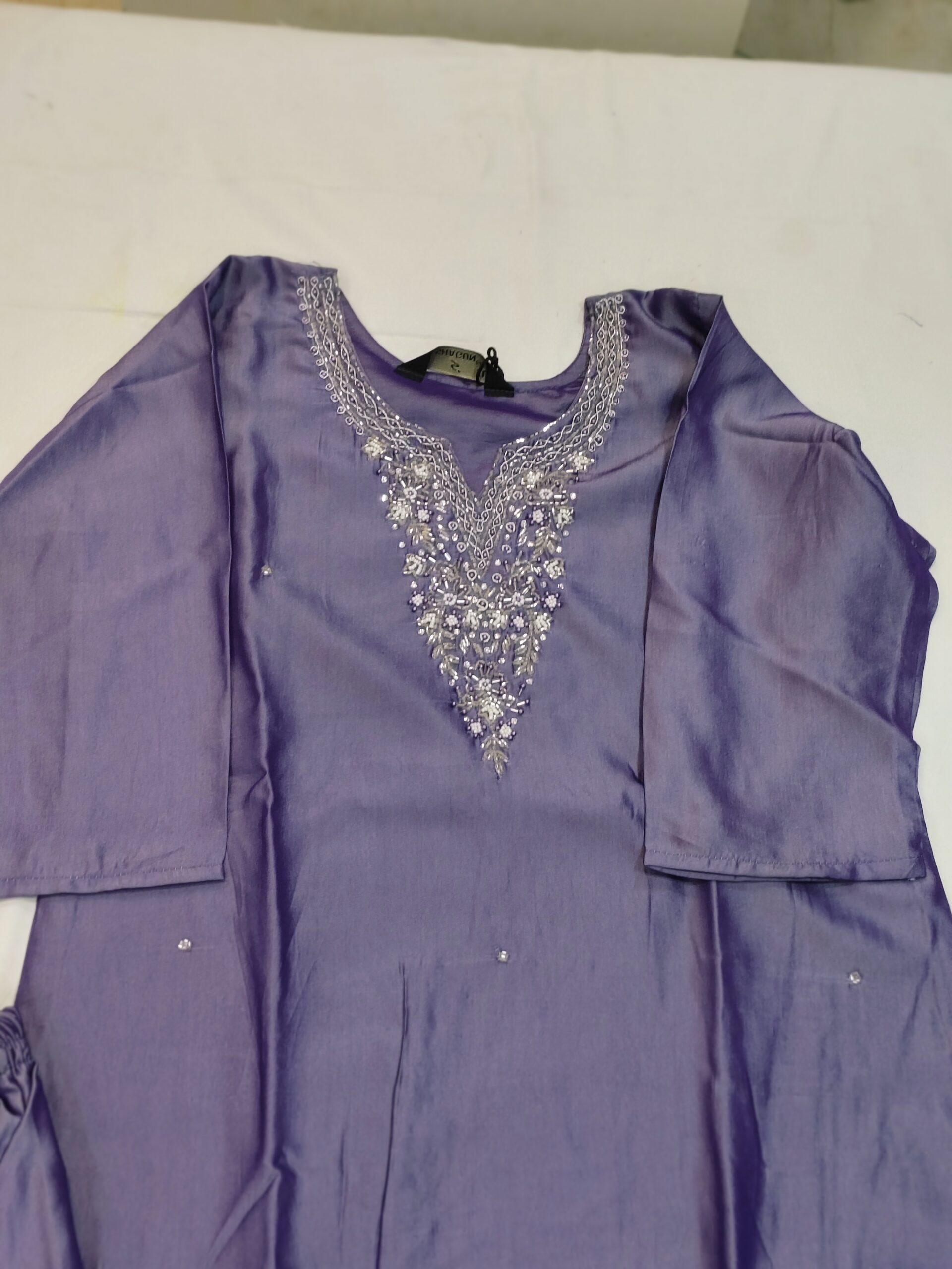 Violet aari work, V neck, 3/4th sleeve, below knee length Top with straight pants & Printed dupatta